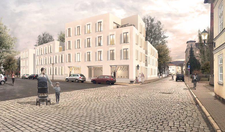 Die neue Bebauung folgt der räumlichen Steigerung durch die straßenbegleitende Bebauung an der Grundstücksgrenze und mit einer Differenzierung der Geschossigkeiten. Diese erzeugt ein Erscheinungbild mit Einzelhauscharakter im Bezug zum Maßstab der umgebenden Bebauung und ermöglicht gleichermaßen ein bauliches Ensemble auf dem Gesamtgrundstück.