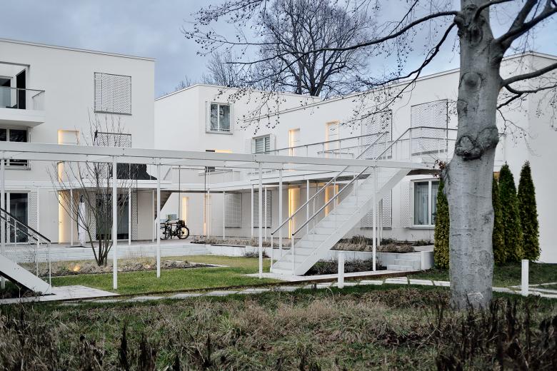 Neben der nun erfolgten Gruppierung um einen gemeinsamen Hof - ganz im Sinne des alten Ge- meinschaftsgartens der „Concordia“ - unterstützt eine besondere Erschließung das Prinzip der nachbarschaftlichen Gemeinschaft für die künftigen Bewohner. Denn die Fugen zwischen den Einzelhäusern nehmen einläufige Außentreppen auf und führen auf ein karoförmiges Stegsystem im ersten Obergeschoss, das die Vorzüge von Laubengangerschließung, Terrassen und balkonartigen Aufweitungen in sich vereint. Auf diesem Wege werden eine effektive Erschließung, eine vielseitige Erreichbarkeit der Wohnungen, Begegnungs- und Aufenthaltsräume - differenziert für Privatheit und Gemeinschaft - erzeugt.