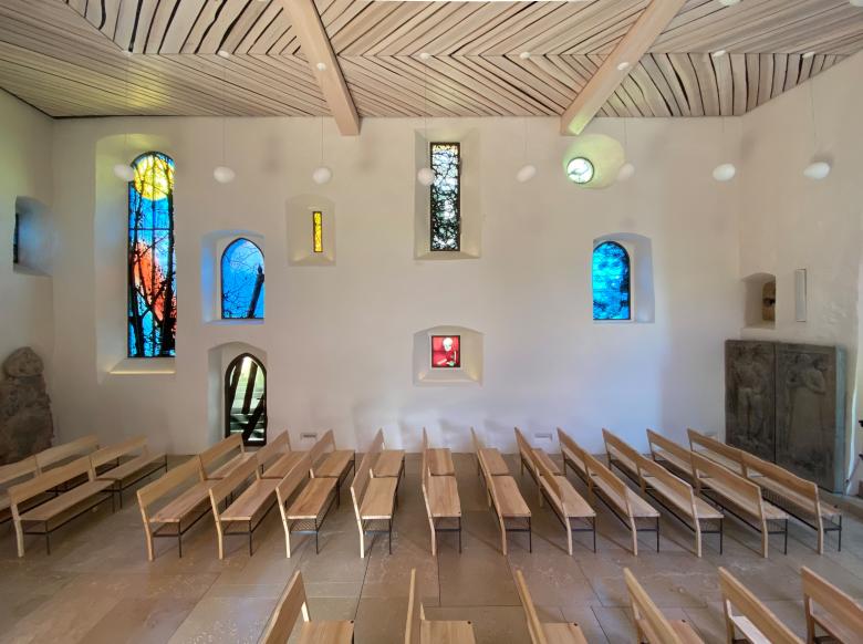 Das Zusammenspiel der Farben und Materialien für Boden, Wand und Decke aus Eschenholz, Muschelkalk und Kalkputz unterstützt in seiner Helligkeit und Natürlichkeit die sakrale Raumwirkung im Gleichnis zum Licht und zur Reinheit (Gott ist Licht und in ihm ist keine Finsternis [1. Johannes 1,5]) und unterstützt gleichermaßen in seiner Schlichtheit die Reduktion der alltäglichen Reizflut.