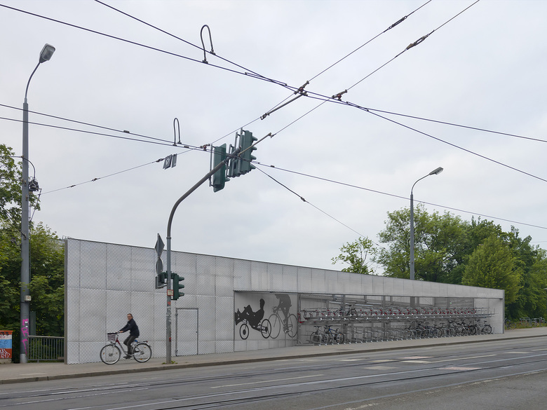 Der schlicht mit Streckmetall verkleidete Stahlbau und die expressive Form übertragen dem eigentlichen „Fahrradschuppen“ thematisch das Motiv der Dynamik und Bewegung und bereichert Erfurt um ein Stadtmöbel.