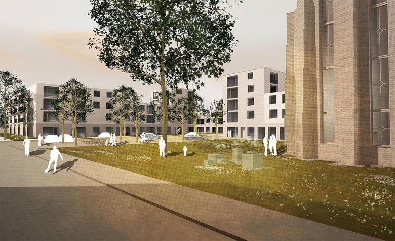 Ein lockerer Baumschleier umgibt das Gesamtquartier und blendet visuell die belasteten Straßen aus. Der zentrale Kirchplatz bildet die neue Mitte des Areals. Mit seinem offenen Rasentapis zitiert er bewährte Bilder englischer Städte. Mit diesem Hybrid aus befestigtem Platz und strapazierfähigem wie einladendem Rasen wird um St. Barbara ein flexibel nutzbarer öffentlicher Raum als gemeinschaftliche Bühne im neuen Quartier angeboten.