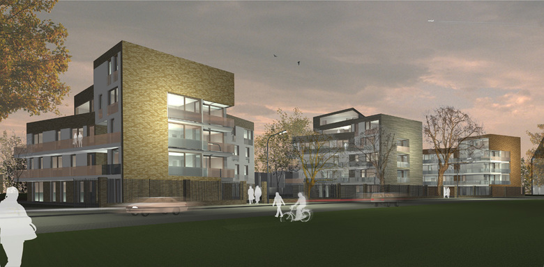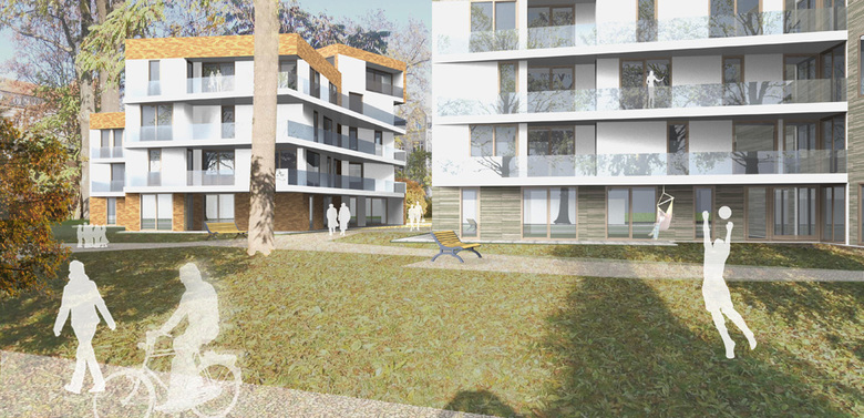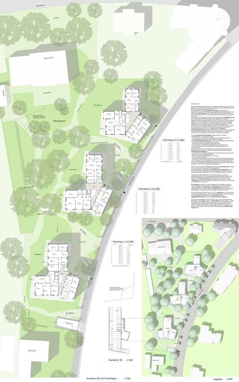 Das Erscheinungsbild der drei Sternhäuser wird in der spannungsvollen Kombination aus Klinker-, Putz- und Glasflächen vorgeschlagen - wobei der Klinker (ein Steinbild pro Haus z.B. gelb-grau; grau-beige und grau-rot) Straßenseite, Sockelzonen und Attikabereiche schützt und stärkt, während die Putzflächen Balkone und Loggien begleiten und Glas für die Fenster zum Einsatz kommt und mattiert als Geländer und Reflektor der Bäume dient.
