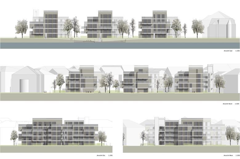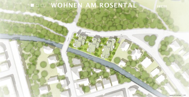 Die drei Neubauten werden dabei von einem großzügigen, gemeinschaftlichen Gartenraum umflossen, welcher neben Orten zum Aufenthalt auch landschaftlich Kinderspielbereiche einbettet. Pflanzbänder mit Gräsern und pflegeextensiven Stauden in leicht wechselnden Schwüngen verbinden die verschiedenen Teilräume.