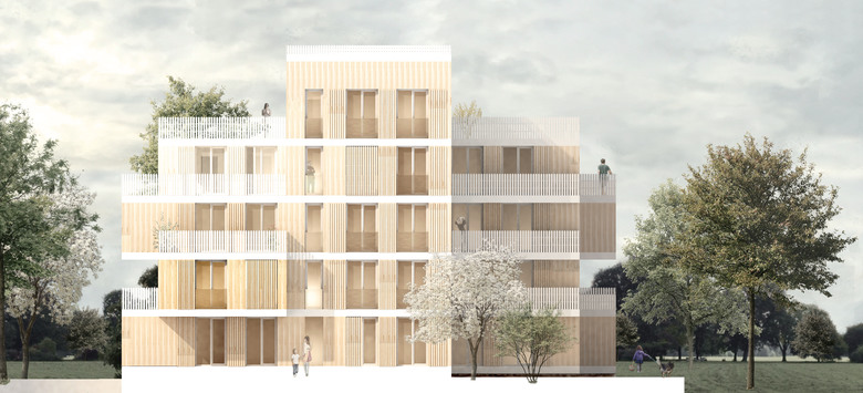 Konstruktiv sind die Gebäude in Massivbauweise konzipiert - elementierte Stahlbetonelemente für Decken, Untergeschoßwände und partiell in den Obergeschossen bilden mit Kalksandsteinmauerwerk ein langlebiges gut speicherfähiges Basisbauwerk. Regionale Herstellung und Vorfertigung begünstigen die Faktoren der Nachhaltigkeit. Nach den Prinzipien zum Einsatz nachwachsender Rohsto e und der guten Trennbarkeit der Aufbauten werden als weitere Fassadenmaterialen hinterlüftete vertikale Holzverschalungen vor Dämmmatten vorgeschlagen. Faltklappläden im gleichen Material bilden den außenliegenden Sonnenschutz. Eine Lamellierung kann schöne Licht- und Schattenspiele spenden und v.a. im EG dem Sicherheitsaspekt zusätzlich Rechnung tragen. Die geölte Holzverschalung verleiht der Baumasse einen leichteren Charakter und wohnlich behagliche Atmosphäre. Alternativ sind Holzwerksto e gut, strapazierfähig und recyclebar einsetzbar. Die Verblendung der Deckenebenden mit hellen Sichtbetonelementen gliedern die Baukörper zusätzlich maßstäblich. Das Gartenzaunmotiv der Geländer soll spielerisch die Zuordnung privater individueller Außenbereiche bei gleichzeitigem Sichtschutz transportieren. Insgesamt gewährt der Fassadenaufbau langfristige Reinigungsintervalle, Wartungs- und Instandhaltungszyklen. Elementiert, durch Deckenebenen und geschosshohe Fenster unterbrochen lassen sich bei Erfordernis partielle Maßnahmen durchführen.