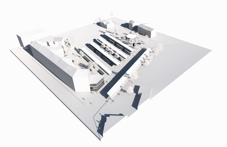 Das Ensemble aus Dächern vermag den Raum unaufdringlich zu konzentrieren und gleichermaßen dem neuen Busbahnhof eine örtliche Präsenz und Prägnanz zu geben.