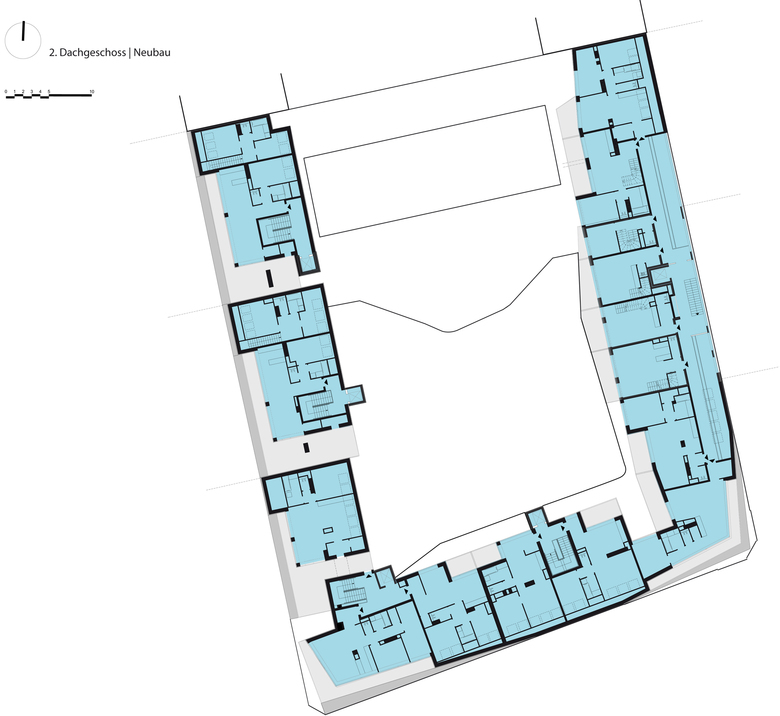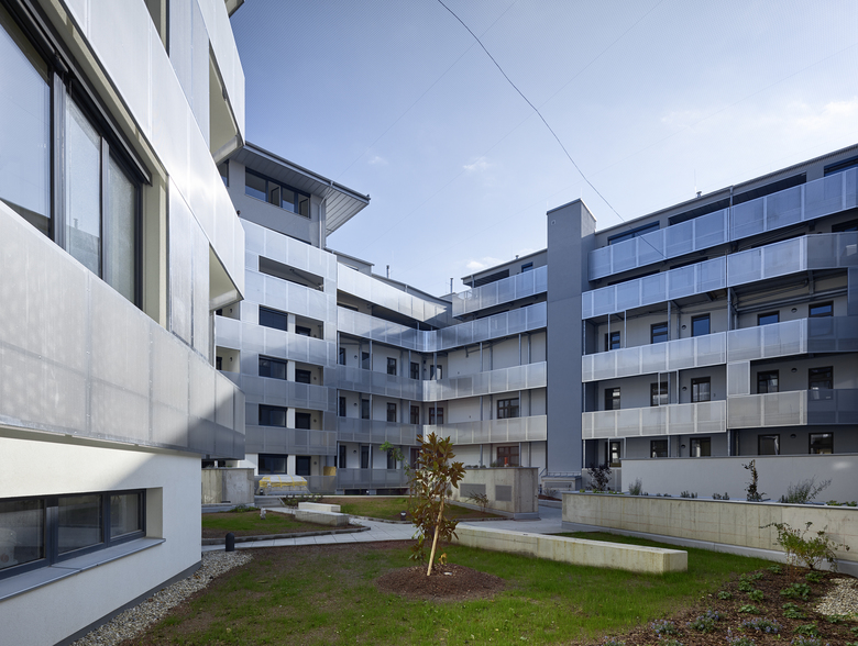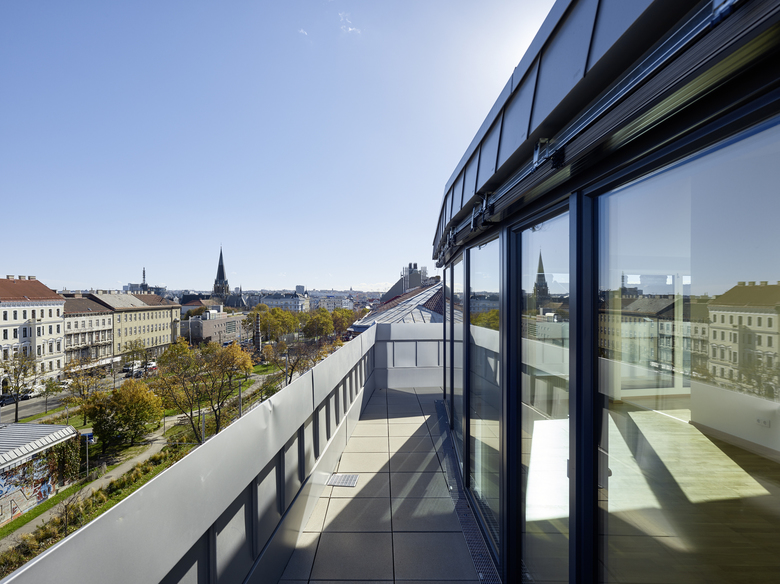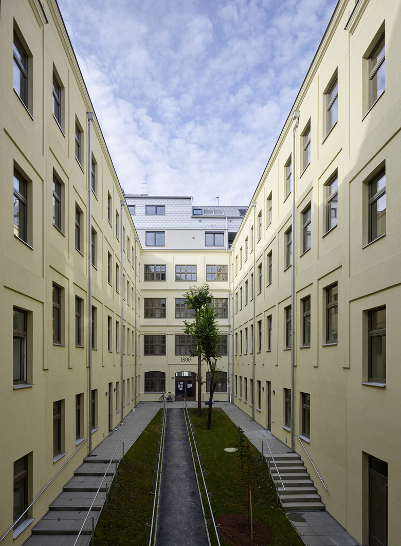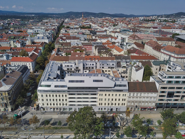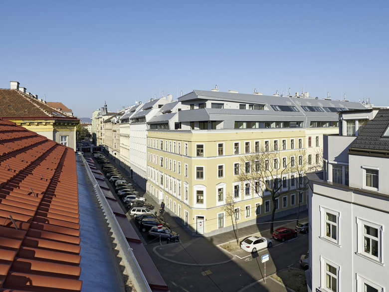 Block- und Sockelsanierung sind zwei klassische Instrumentarien der „sanften Stadterneuerung“ in Wien, mit denen gründerzeitliche Bausubstanz über Liegenschaftsgrenzen hinweg partiell verdichtet und entkernt werden kann. Ein gründerzeitlicher Block der Bauzeit um 1900 an der Kreuzung Neubaugürtel im Osten und der sonnigen, ruhigen Goldschlagstraße im Süden wurde von den Architekten P.GOOD (Martin Praschl und Azita Goodarzi) nun vorbildlich saniert und erneuert. Die besondere Herausforderung für die Architekten bestand darin, durch gezielte Maßnahmen an diesem rauen, lauten, verkehrsumtosten Stück Stadt eine durchgehend hohe Wohnqualität für alle Bewohner zu erzielen. P. GOOD entkernten den Hof, der von parasitären Bauten mit temporärer Bordell-Nutzung zugepflastert war, ersetzten einen desolaten Altbau durch ein Neubau-Implantat und doppelten eine bestehende Feuermauer mit einem schmalen Altbautrakt um einen weiteren Neubau auf. Dieser Bauteil besticht nun in jeder Wohnung mit der faszinierenden Dualität von Altbau-Raumhöhe und der Helligkeit und dem privaten Freiraum des Neubaus. Alle übrigen Gründerzeit-Häuser wurden saniert, teils Wohnungen zusammengelegt und das Dachgeschoss mit zwei Geschossen ausgebaut. Im Sockel konnte gewerbliche Nutzung mit Geschäften und Büros erhalten werden, der gründerzeitliche Bestand wurde hofseitig teils um tiefe, gut nutzbare Loggien und Mietergärten erweitert. Eine Verkleidung aus transluzentem Metall vermehrt die Helligkeit im Hof und sorgt für ein ruhiges Erscheinungsbild. Schallschutzfenster im Bestand und eine lichte, großzügige Laubengangerschließung im neuen Bauteil am Gürtel schützen die Wohnungen vor Lärm, raumhohe Verglasungen, Terrassen und Loggien im ausgebauten Dachgeschoss schaffen hohen Wohnkomfort. Hier lässt sich von den Terrassen aus die Großzügigkeit des Gürtels als weiter, urbaner Freiraum gut erleben. Der charmante, extrem schmale, lange mittlere Innenhof blieb erhalten, unter dem ersten Hof konnte man eine Tiefgarage mit 26 Stellplätzen schaffen. Das expressiv geformte, schillernde Schuppendach fasst den Block in der Dachzone zusammen, im Erdgeschoss tun es die Geschäfte. Insgesamt wurde sowohl die Qualität der Wohnungen, als auch des Umfelds mit dieser Maßnahme deutlich verbessert.
