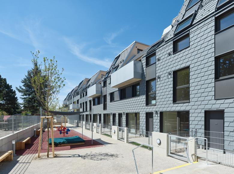 In Zeiten der steigenden Grundstückspreise und der explodierenden Baukosten ist der leistbare Wohnbau unter enormem Kostendruck. Oft geht dies in der Realisierung zulasten der baulichen Details und der Materialien. Dies konnte hier durch das Engagement der Architekten vermieden werden. Die Fassade und die geneigten Dachflächen des hofseitigen Bauteils wurden mit Aluminium‐Schindeln verkleidet, was ihm einen zusätzlichen individuellen Charakter verleiht und einen Dialog mit dem in warmen Erdfarben gehaltenen höheren Bauteil eröffnet.