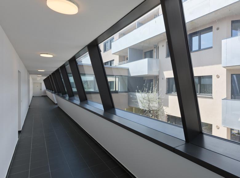 Fünf Geschäftslokale und ein großer Gemeinschaftsraum im Erdgeschoss an der Breitenfurter Straße verstärken die Schnittstellen zwischen belebter Stadt und ruhigem