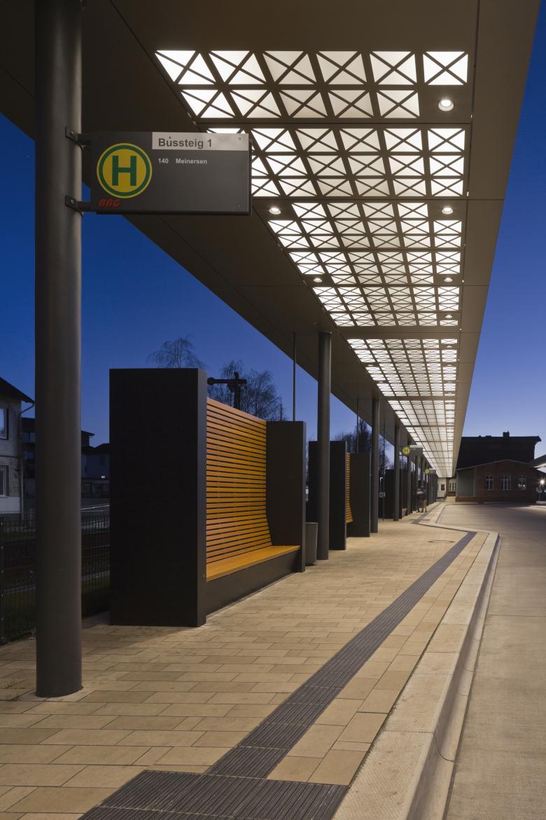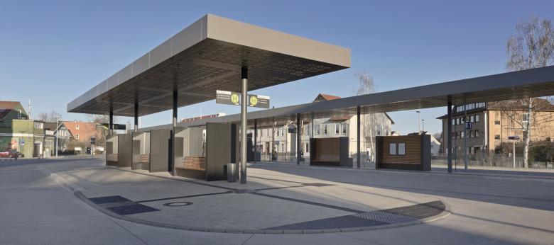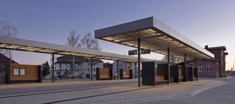 Die prägenden Elemente des Busbahnhofs sind die neuen Überdachungen der Haltestellen, die sich auf zwei Plattformen verteilen. Die vorgeschlagene modulare Konstruktion ermöglicht spätere Erweiterungen der überdachten Bereiche. Die Sitzgelegenheiten und Info-Module werden in die mit Holzleisten belegten Rückwände der überdachten Warteboxen aus eingefärbtem Beton einbeschrieben. Durch die in die Dachunterseiten integrierten Lichtdecken erhalten die Wartebereiche eine dezente und stimmungsvolle Illuminierung.