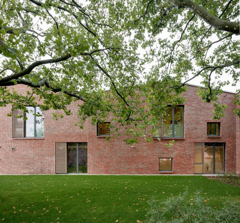 Deutliche Rücksprünge in der Erdgeschossebene definieren klar ablesbare Eingangs- und Übergangssituationen zum Freiraum. Große und kleine annähernd quadratische Fensteröffnungen erzeugen ein spannungsvolles Fassadenspiel, stellen wichtige Außenraumbezüge zum bestehenden Landschaftsraum her und lassen den Baukörper als kraftvoll-plastische Gebäudeskulptur wirken. Die gefaltete Dachfigur verleiht dem Baukörper auch im Inneren begreifbare kindgerechte Dimensionen.