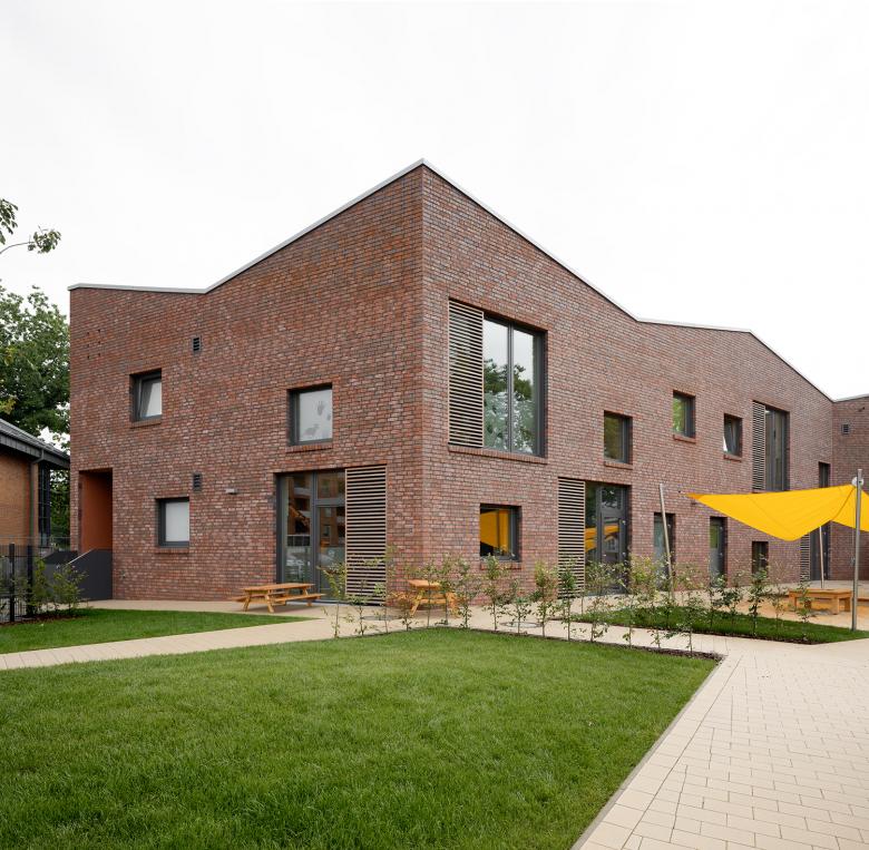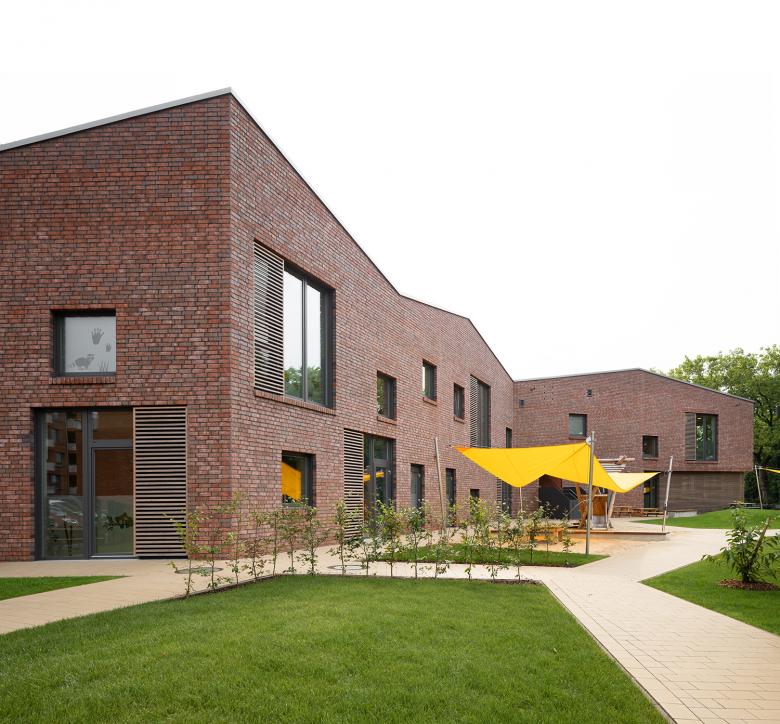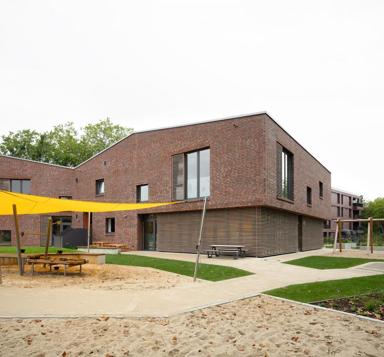 Im engen Zusammenspiel mit den gegenüberliegenden Wohngebäuden bildet der Neubau der Kita den markanten Auftakt zum neuen Wohnquartier Buchholzer Grün in Hannover.