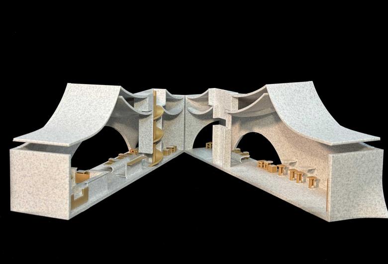 At the heart of the space stands a functional art installation: the Drifter Tower. Constructed from a composite of steel structure and reclaimed bricks, the tower rises approximately 7.5 meters high and integrates a rainwater harvesting system for plant irrigation and sanitary use, embodying ecological sustainability. Its winding staircase evokes the local legend of “ascending to immortality” in Xianju while blurring the boundaries between indoors and outdoors. Upon reaching the summit, visitors can overlook the panoramic stream views, experiencing both a topographical and spiritual elevation.
