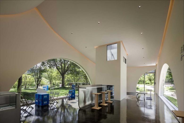 Architectural and interior design are unified under the theme of "fluidity." The external façade features curved floor-to-ceiling windows and folded walls, echoing the ripples of the stream while reducing the building's visual impact on the natural environment. The layout unfolds in a semi-enclosed manner around the central "Drifter Tower," with multiple openings guiding airflow and sightlines to enhance spatial transparency. Indoors, a language of frames and curves defines the space, with ceilings adopting continuous arched forms and embedded lighting strips to evoke the shimmering effect of water reflections.