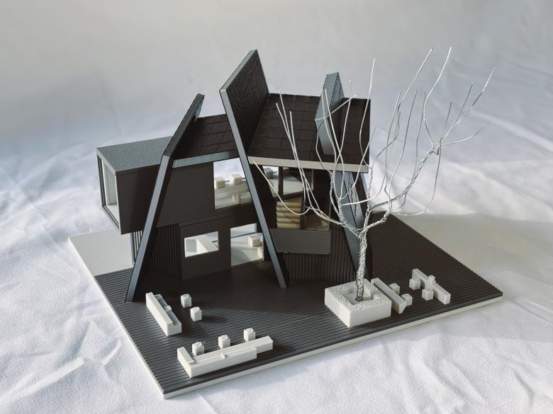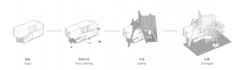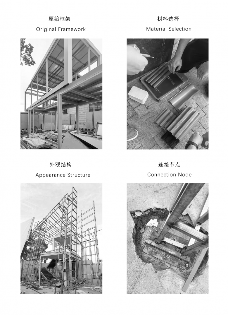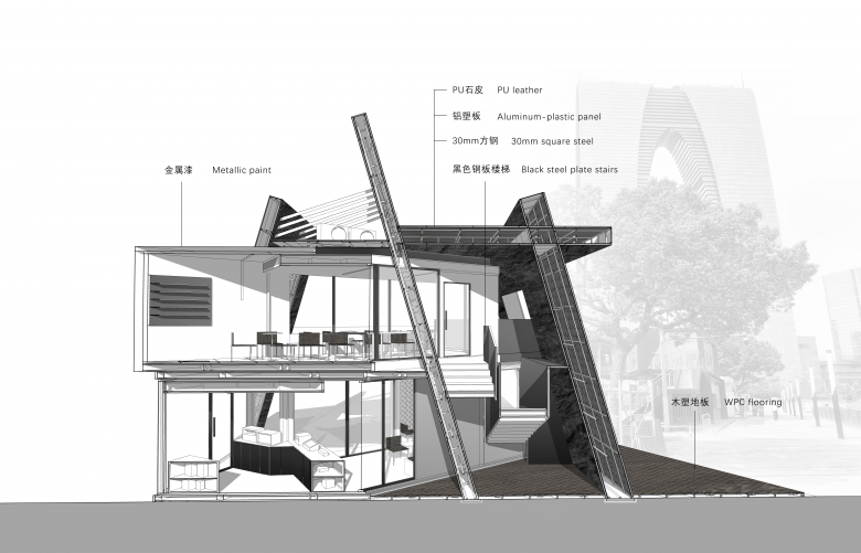 The external staircase is embedded at an angle in the gap between two walls, embodying the spatial narrative of upward exploration through cracks. Structurally, an additional horizontal steel frame installed on top of the original container secures the staircase to the main building, while also serving as a rain shelter. Air conditioning outdoor units are concealed within this frame to prevent equipment exposure from compromising facade integrity, thus achieving an integrated design that unifies structure, function, and aesthetics.
