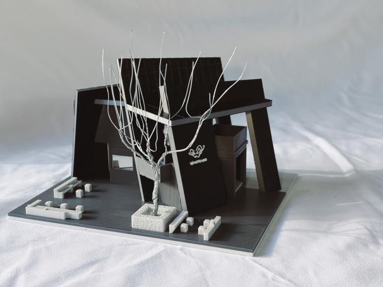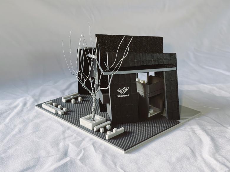 The inclination angle of the wall panels echoes the staircase slope both visually and structurally, and the horizontal steel frame connects the three components into an organic whole. This design not only reinforces the spatial logic of growth from cracks but also leverages steel structural elements to form a Brand Creative Merchandise