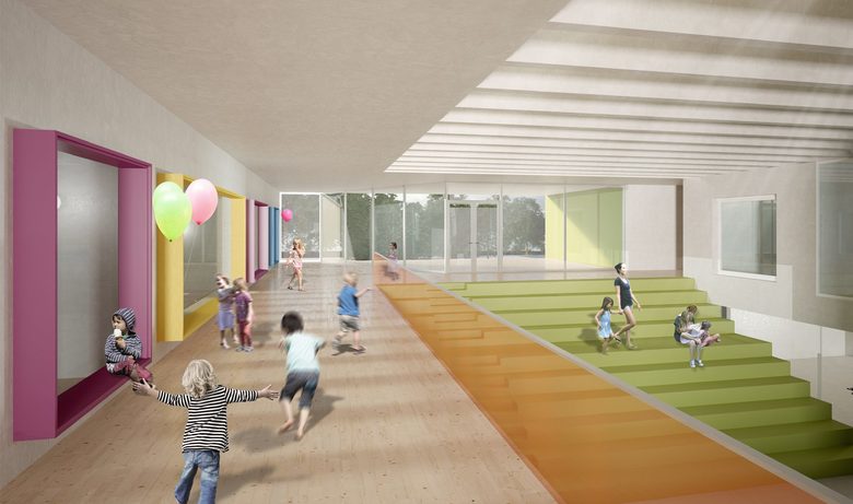 Die Fassade erhält individuelle Fenster, die mit tiefen und bunten Leibungen von außen auf den Kinderhort aufmerksam machen. Sie unterstreicht die Individualität jedes Kindes und lässt Andersartigkeit zu.