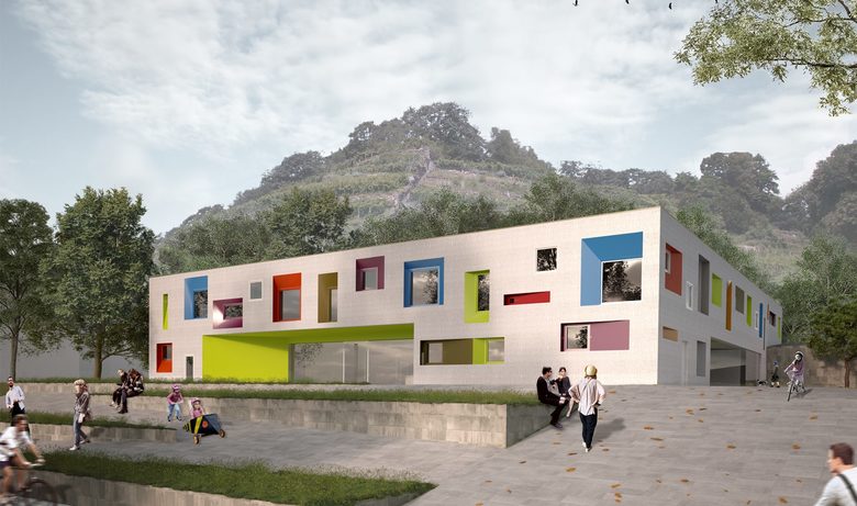 Der gemeinsame Vorplatz gestaltet sich wie die umliegenden Weinberge in eine kombinierte Rampen- und Treppenanlage, die Möglichkeiten zum Verweilen und Spielen bietet. Ein gemeinsam von Schule und Hort nutzbarer Multifunktionsplatz setzt den Endpunkt für diese Anlage.