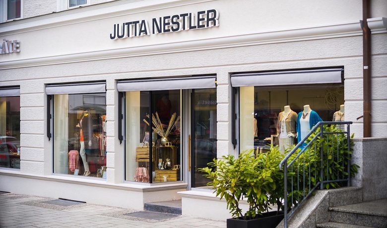 Die Schaufensterfläche setzt sich farblich von den oberen Etagen ab. Im Bereich des Erdgeschosses wird die Fassade mit einem Dämmputz versehen, der zusätzlich durch Bossen gestaltet wird. Deren Aufteilung wird aus der historischen Ansicht übernommen. Die Einteilung der Fenster und Türen ergibt sich aus dem Rhythmus der oberen Etagen, damit wieder ein Bezug hergestellt werden kann. Die dabei entstehenden 5 Fensterflächen erhalten Fallarmmarkisen, die der Kleinteiligkeit der Gestaltung folgen. Die Fensterrahmen sind in eloxiertem Aluminium ausgeführt. Als Aluminiumschaufensteranlagen entsprechen diese heute mit einem Sicherheitsglas und einer zweifachen Wärmeschutzverglasung den heutigen Ansprüchen.