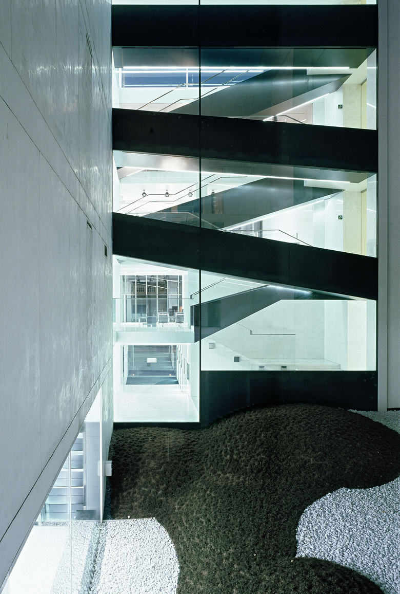 Situated just a few hundred metres from Corso Buenos Aires, the Dolce&Gabbana offices and showroom in via Broggi, Milan, is a combination of classical and contemporary, smoothly interacting with the surrounding cityscapeThe 1920s’ building, used for offices and reception spaces, is enhanced by focusing on its architecture and maintaining its elegant, classical style. The 1960s’ building, used as a showroom, has been completely hollowed out to create a 3-storey open space crowned by small terraces constructed out of the restaurant structures. It completely changes skin on the outside, cladding itself with glass in a very tightly-knit modular pattern. This gives it a much more contemporary feel, which seems to create a subtle line of rupture between the two buildings, whereas it is merely a junction line. The glass structure turns into an almost immaterial prism, thanks to the choice of reflective materials (glass and shiny steel sheets) enveloping it in an aura of eclecticism by means of simple forms described by the effects of shadow and light during the day. The building creates a large front of diffused light offering glimpses of garments from the fashion house’s collection, which run along the perimeter of the façade. The building’s transparency opens it up to the city and passers-by, stitching it back together with the neighboring building. Transparency emerges from the façade design featuring a regular pattern of vertical sunscreen shutters made of opaline glass, partly inspired by a work by the British artist Damien Hirst entitled “Some Comfort Gained from the Acceptance of the Inherent Lies in Everything” from 1996. Hirst showcases the bodies of two cows. In the same way, Piuarch seems, at least on the outside, to be sectioning the showroom’s large open spaces into lots of separate windows, focusing on every individual item of clothing from the collection in via Broggi.