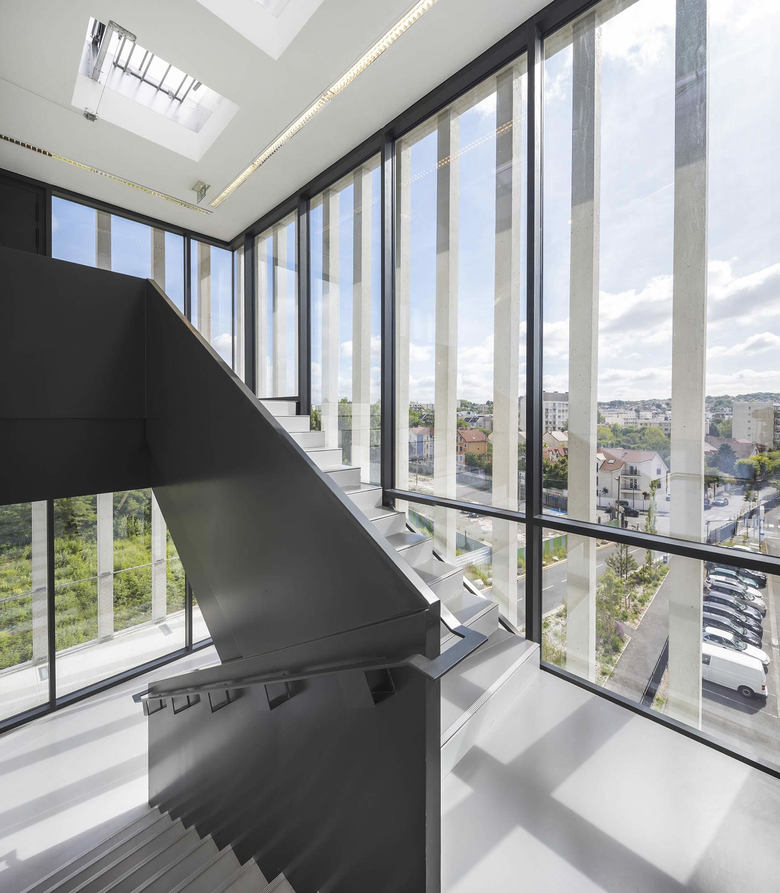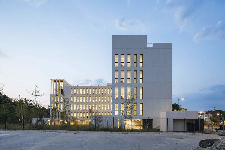Designed by Piuarch, Stefano Sbarbati and Incet Ingénierie, the IDF Habitat Headquarters in Champigny-sur-Marne was inspired by the desire to create an efficient, functional compelx and above all one that stands as an indispensable element in the area’s redevelopment process. Characterized by an L-shaped plan and a silhouette that varies in height, the volumes develop into an articulated form, establishing crisp lines and allowing the square in front to be defined as a collective space. Each side also reacts to the existing surrounds through a relationship of solid and empty spaces: at the entrance, and thus facing the square, the façade is a permeable screen completely covered by glass hidden behind a system of loggias of varying heights, interrupted by a series of breaks in the pattern that make the composition more dynamic. The sides of the building opposite the entrance, facing the railroad and along the road, are more compact with a tight rhythm of vertical openings: these are the south, east and west facades, where it is necessary to filter the solar gain and to create an acoustic barrier. The shell is made of concrete cast onsite and it integrates the construction system: the result is a free plan, which can be organized according to the needs and can be transformed over time.