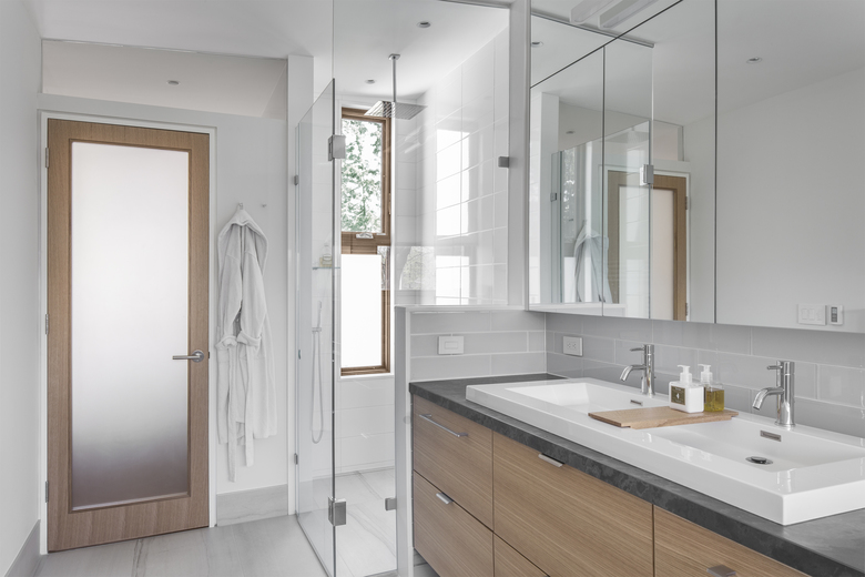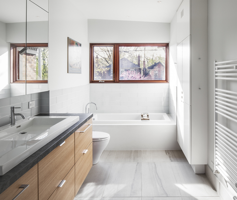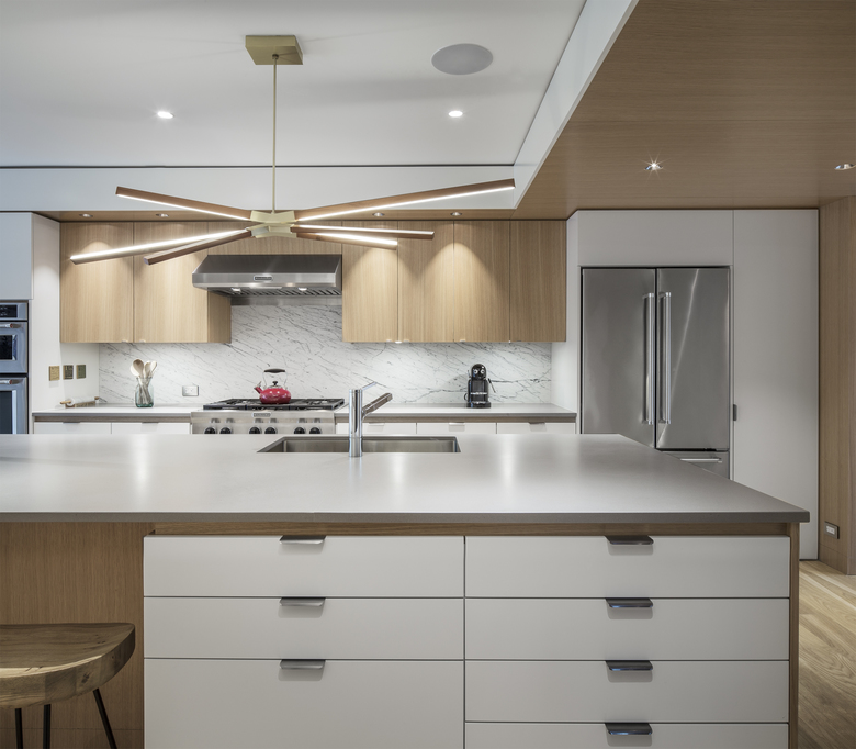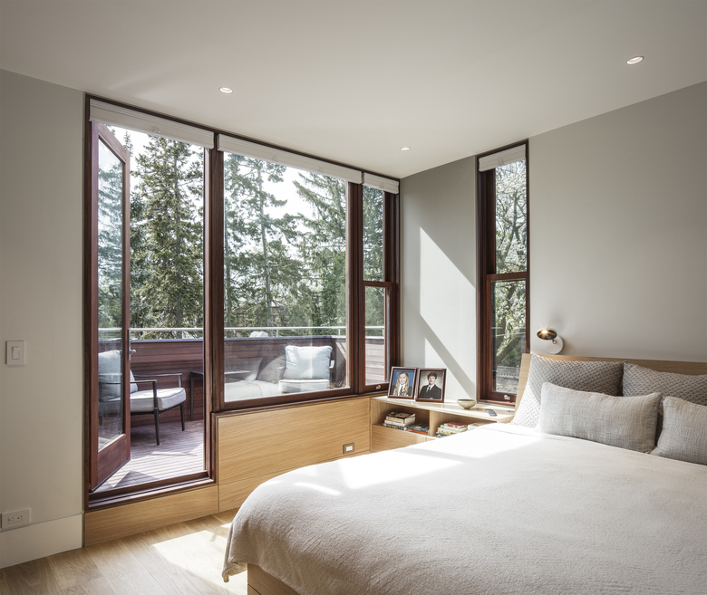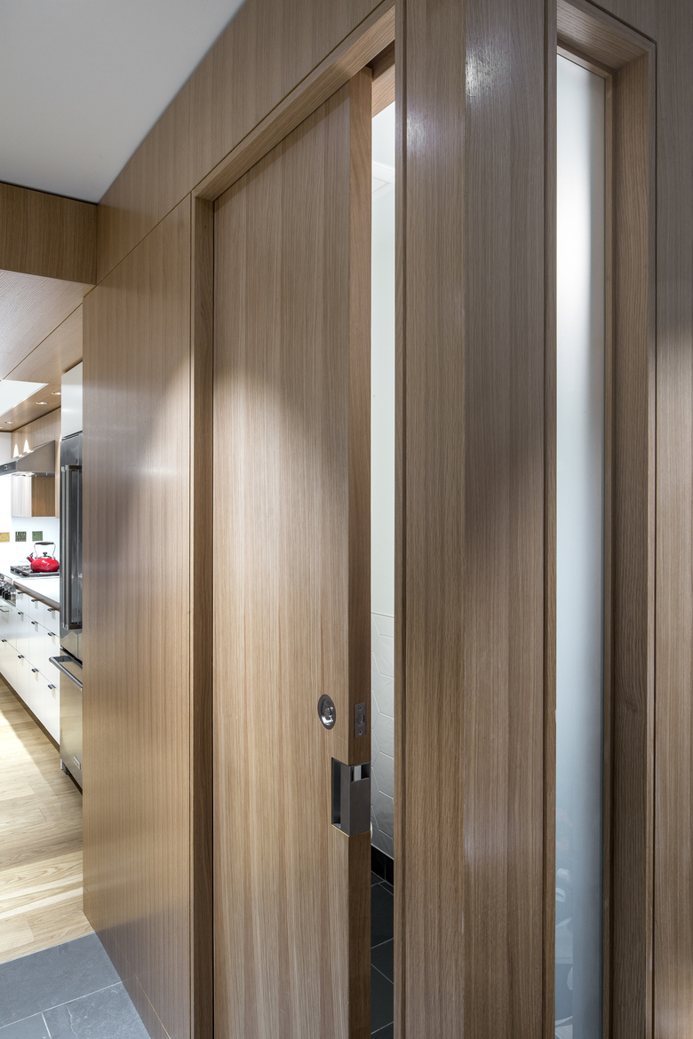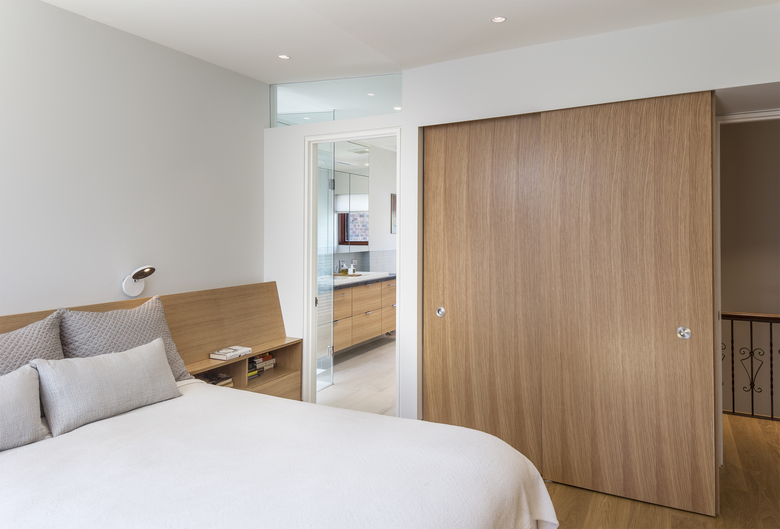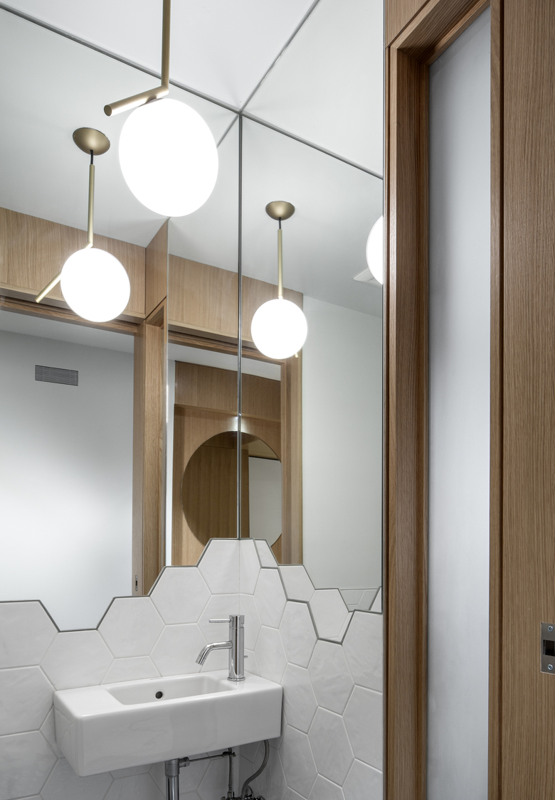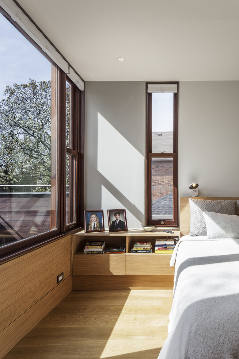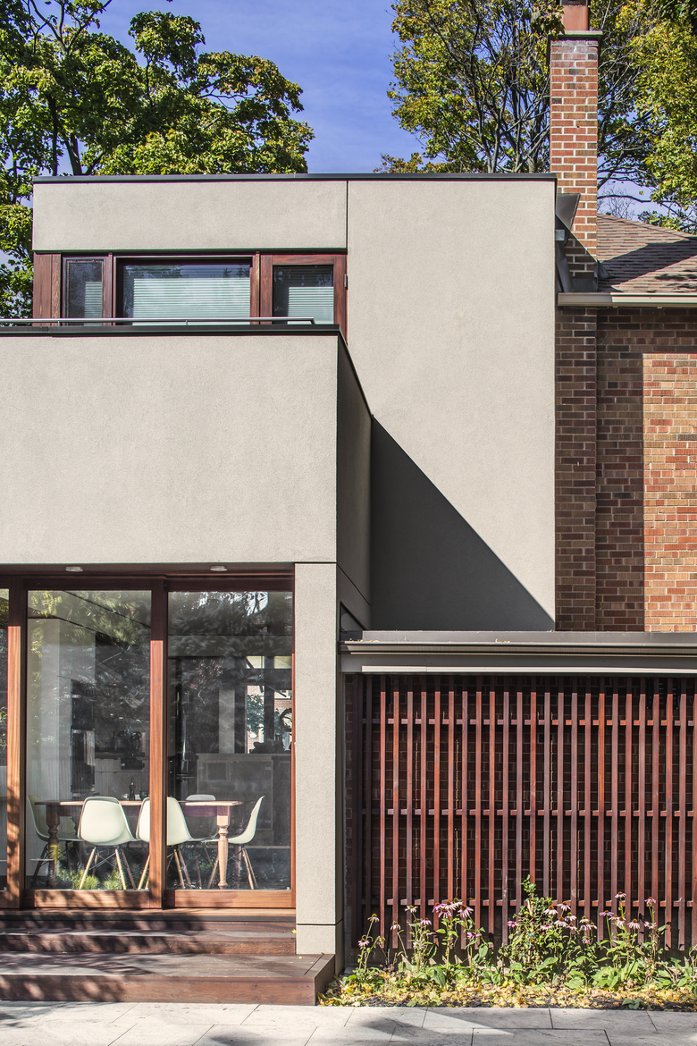 On both floors, views now extend through the house north to south. Relocated to the second floor of the stucco-clad addition, the new master bedroom contains an ensuite bath and opens onto a south-facing deck. The basement contains a renovated family room and expanded laundry. Throughout, storage is seamlessly integrated. Attention to detail extends to the smallest rooms in the house, like the new powder room, where a mirrored corner ‘flows into’ angles generated by the installation of hexagonal tiles.