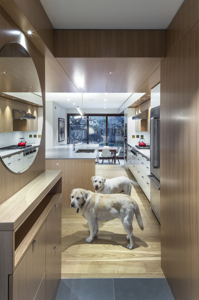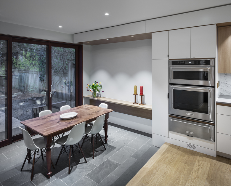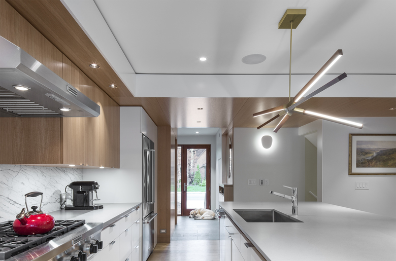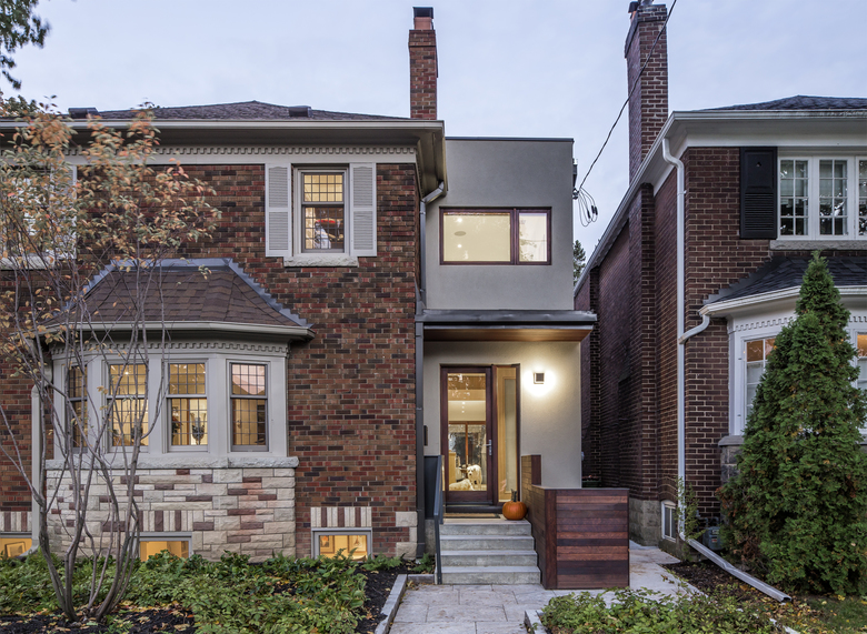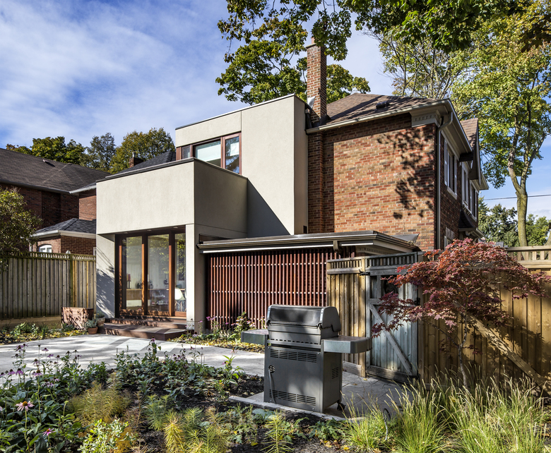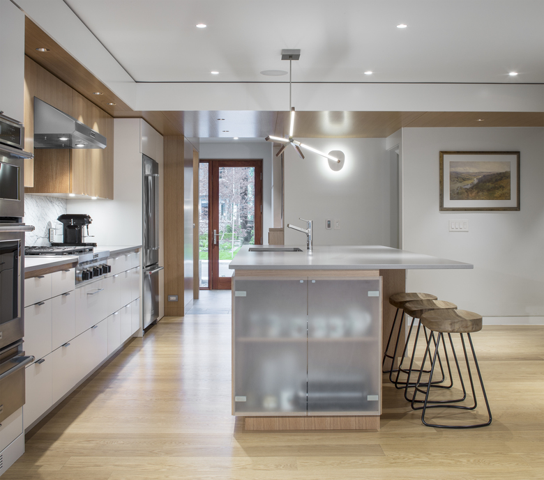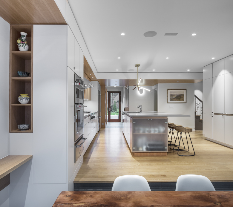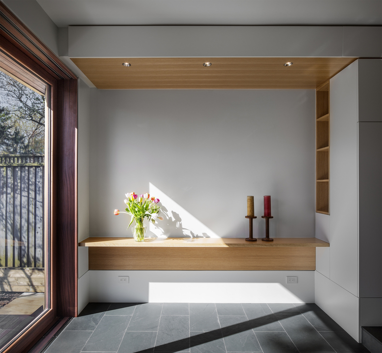 The owners of a traditional 1940s house on a large corner lot wanted a substantial renovation and addition that would open up their foursquare brick home and provide a contemporary but harmonious counterpoint to it. PLANT demolished a previous addition along the west side to create a new entry on the north that combines mudroom functionality with the polished but informal elegance of oak cladding. This entry leads into the spacious new kitchen, which in turn steps down to the new sunroom bordering the back patio.
