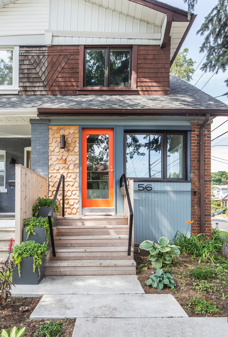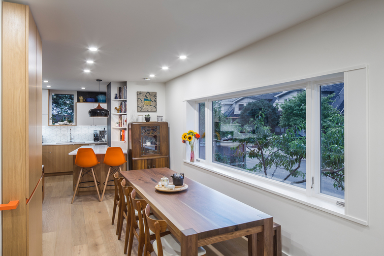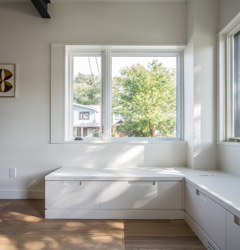 A previous renovation had shifted the main entry from the front to the side of this semi-detached house on a corner. PLANT’s ground-floor renovation and addition re-instated the front entry as the primary one, and leveraged the site’s access to light on three sides to create an open and airy kitchen, dining, living, and entry area.