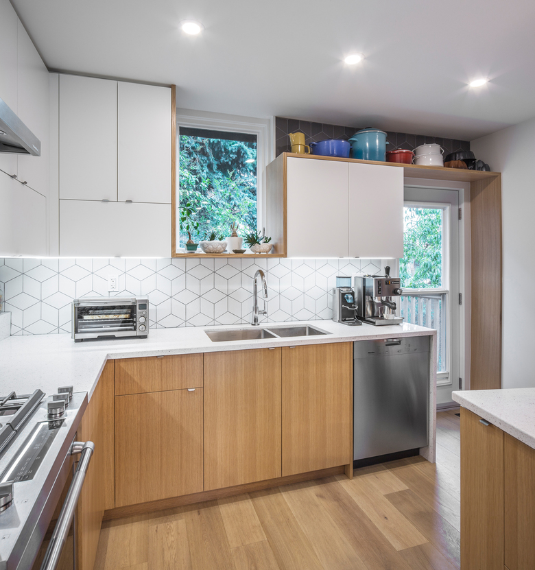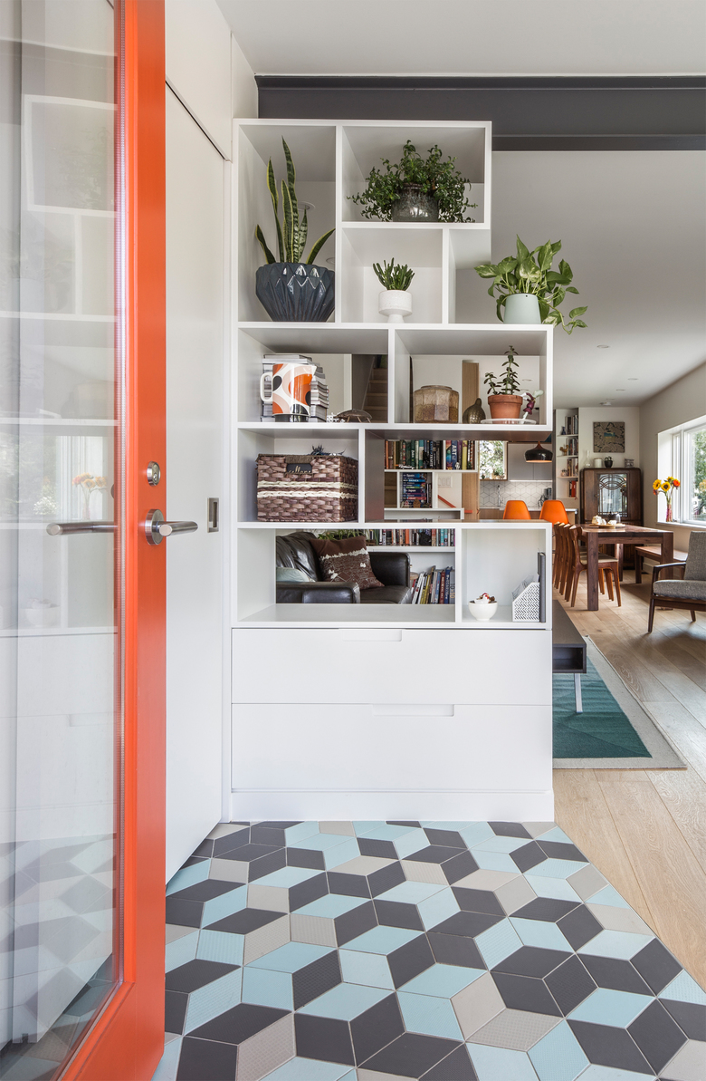 The clients are a young couple who write a popular food blog. We redesigned the ground floor to meet their specific needs for a test kitchen. They also asked for help with the classic problem of ‘so many things, so little space’. We incorporated many types of playful, built-in storage, including shelving, window seats, and the cabinetry flanking the entry and new stairs to the second floor.