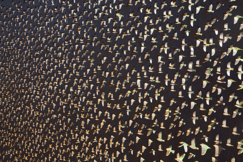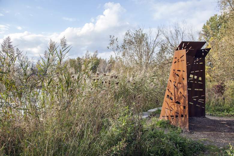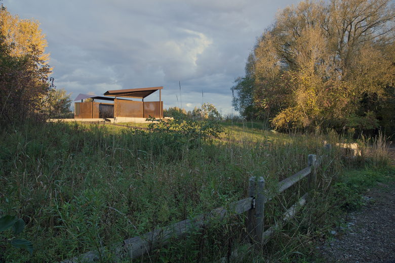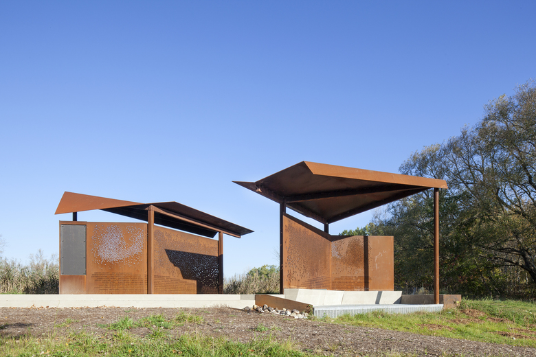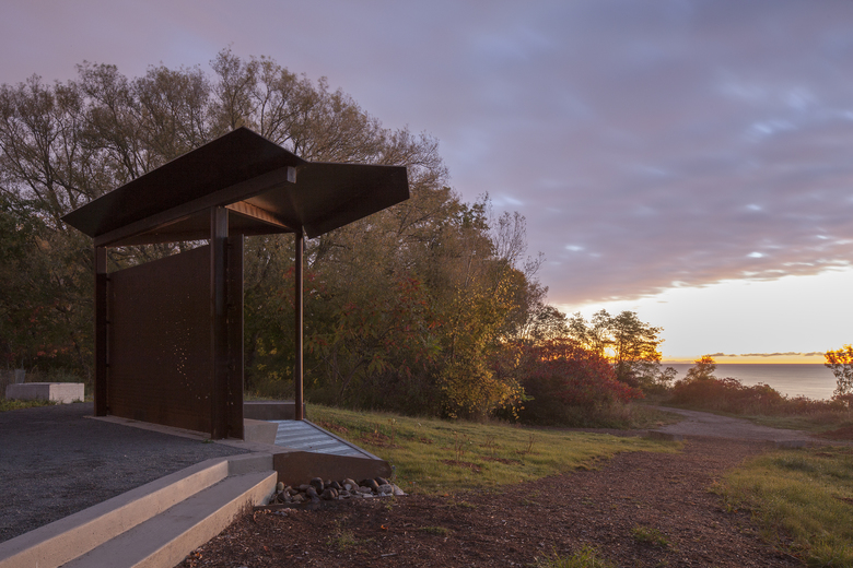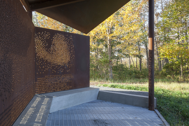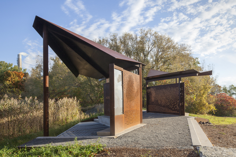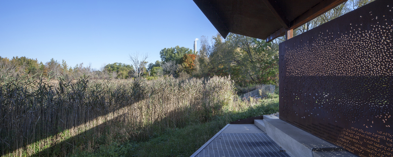 The design explores the use of architecture as a means of framing, enhancing, and respecting the natural qualities of one of Toronto’s most beautiful parks. Folded into shapes evocative of flight, sheets of weathering steel form the pavilions. Laser cut through the Viewing Pavilion’s walls are clouds of birds on the wing and names of species spotted at this significant migratory flyway stopover site.