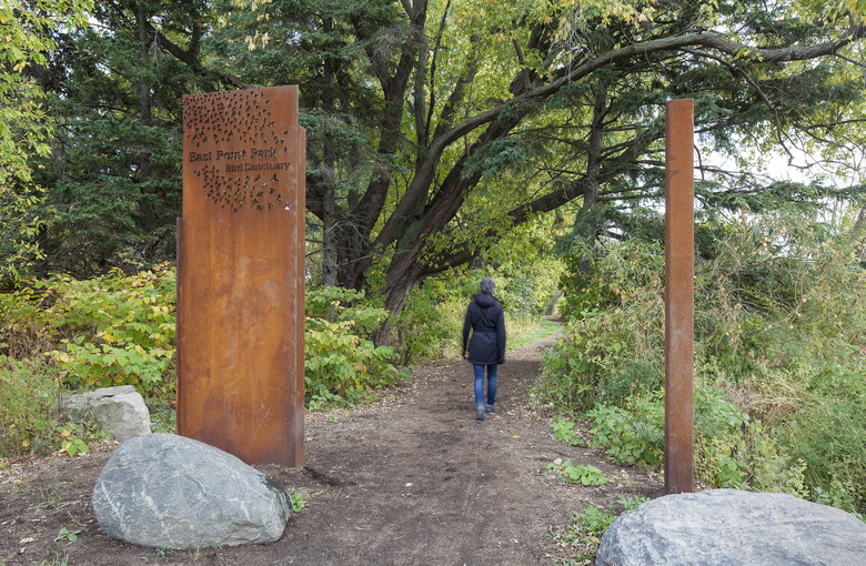 This project is part of a citywide initiative to enhance and protect bird habitat and increase birding activity through public education programming. East Point Park is the first of six key sites to be developed and improved over the next several years. Its two Phase One architectural structures, a Viewing Pavilion and Bird Blind, are complete; a Soundscape Pavilion is planned for Phase Two. Connected by new and rehabilitated paths and framed by interpretive signage and seating, these unobtrusive architectural interventions enhance the structure of the site to promote public use and foster stewardship in support of bird habitat in the city.