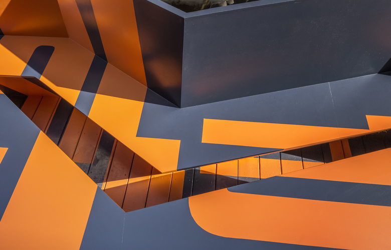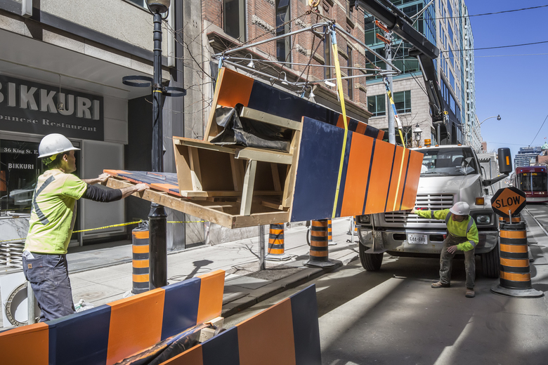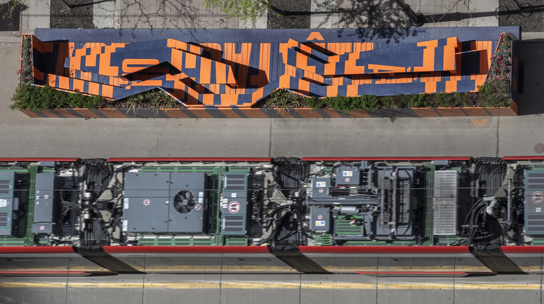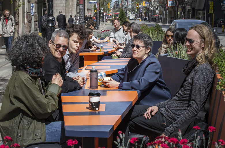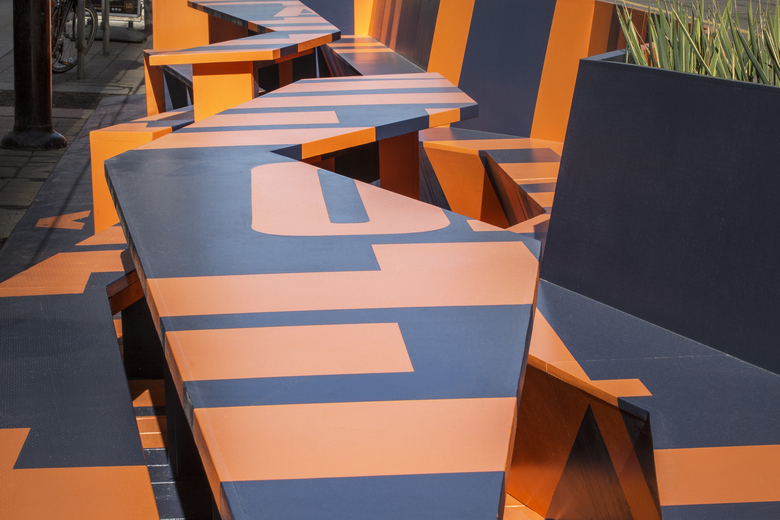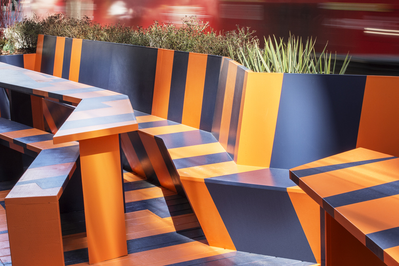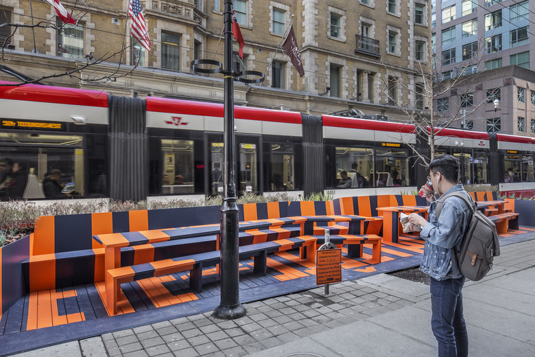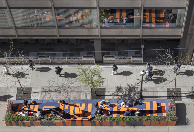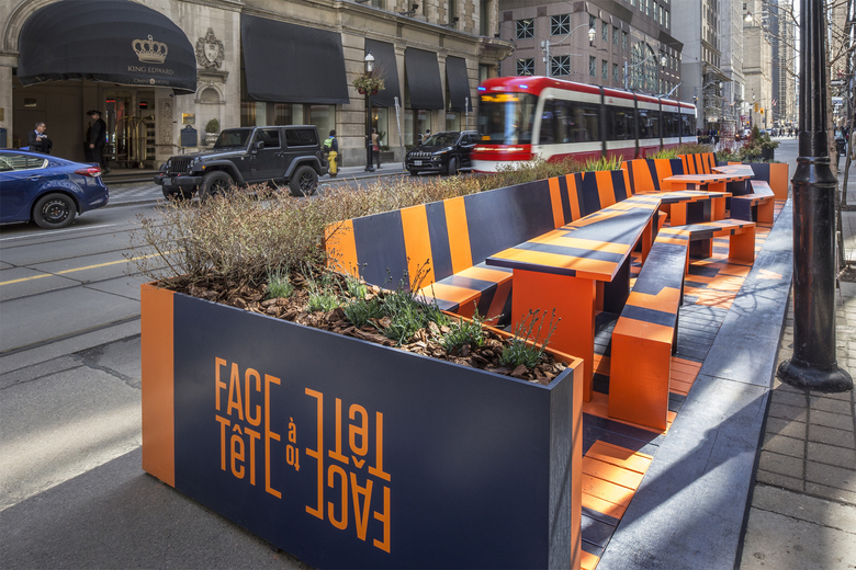 Face to Face/Tête à Tête creates a place for shared conversation along 44 feet of roadway. With two unexpectedly long tables (13 and 16 feet), flanked by continuous benches and wrapped with planting, this is a place for concentrated community conversation, animated inside the words Face to Face/Tête à Tête dynamically projected over all of the surfaces – bench, planters, tables, and deck. With only six feet of width overall, the narrow striking blue and orange room promotes both intimacy within the bustle of King St., and deliberately intensifies the conversation. Shaped like boomerangs, one table angles toward the street, and one toward the sidewalk, subtly inviting participants to the table angled to watch the passers-by on the sidewalk, or to hail to those on bike and streetcar. The table is a central focus recalling big family dinners – promoting larger collective/community gathering, yet the narrowness allows for individual occupation, co-working, musing, lunching, and dreaming.
