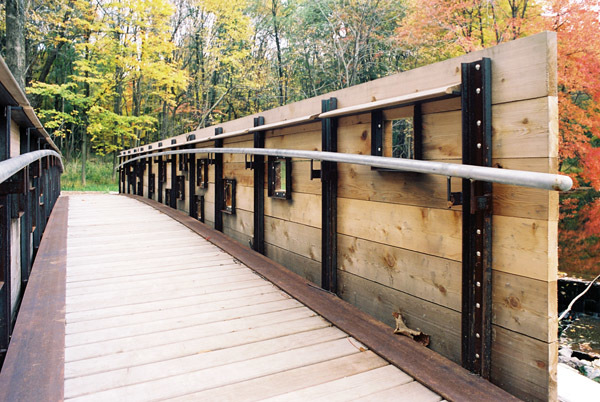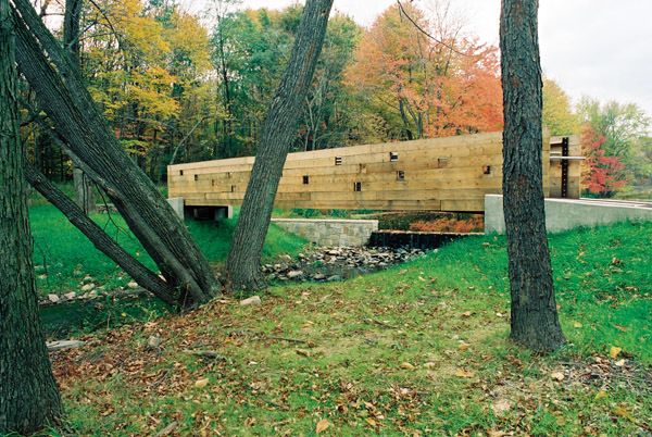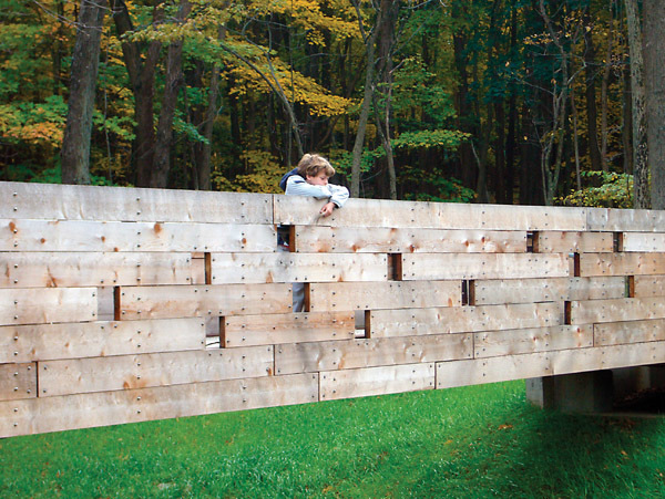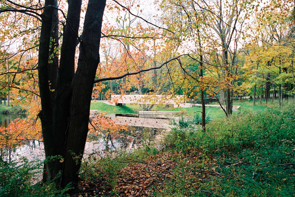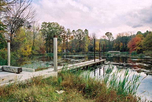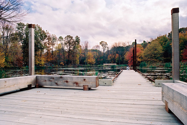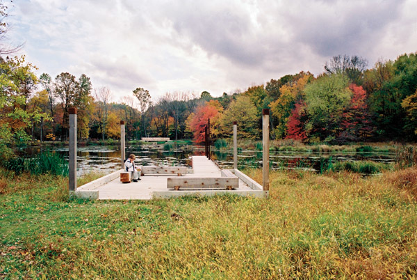 This project is being used by funders as a test project to demonstrate the merits of non-material, non-exploitative, and contemplative uses that do not disturb the essence of a place. Although the adjacent religious uses provide a cue to this use, the intention is to reveal the natural spirituality of the forest, wetland and pond. The scheme sees light as the main shaper of space, transforming perception of the place over the course of the day. Its presence turns fields of marsh grasses into ponds of light, lines of trees into brilliant walls, and turns the pond into a mirror for the sky and the trees. The site is now used as an outdoor classroom both formally and informally for ecological and arts curricula. “A conversation of trees” is a sample of how uses can coincide as intimate seating is provided only where trees have grown close enough to have an intimate conversation. Phase 1 of the project included the reconstruction of a dam, fireplace, new bridge, and teaching dock. The design included input from local grassroots groups and NJ Audubon, and it was coordinated with the town. This project is funded by the G.R. Dodge and Nathan Cummings Foundations, and by private local donations.