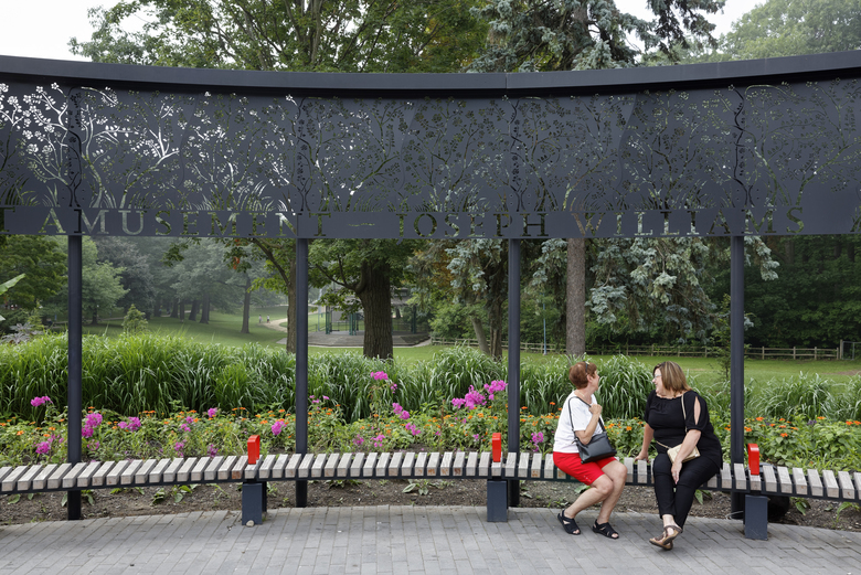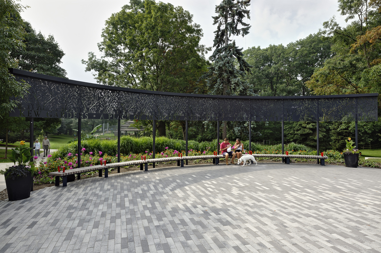 The new, 18-metre-long ornamental screen bears Kew founders’ own description of the park – “a place of innocent amusement.” Conceived as a tribute to the park’s picturesque Victorian style – and as a 21st-century complement to Kew’s intact original Victorian chinoiserie-style bandshell, the screen’s imagery evokes 19th-century chinoiserie wallpaper. The cut flowers and leaves on the screen meld with the park’s trees in behind them. Raised high, the screen frames community events held on the plaza and provides continuous framed views into and out of the park.