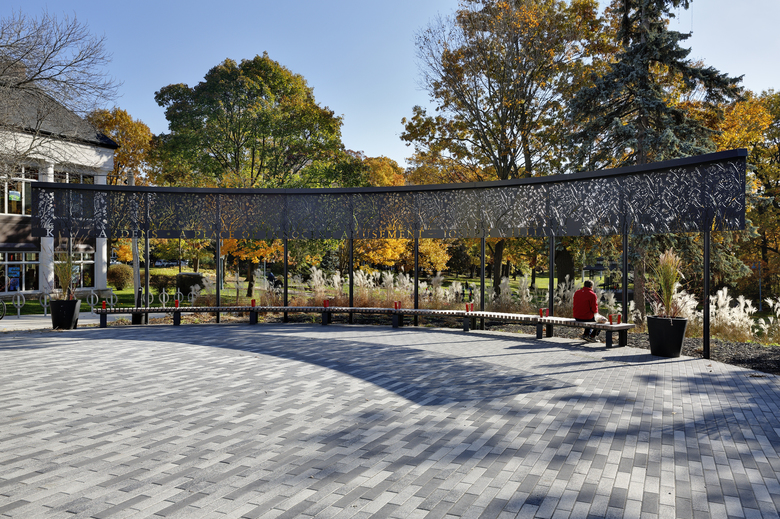 This landscape creates two new loci for gathering, connected by an expanded sidewalk with a pattern that fades out irregularly to the south, evoking the shoreline. At the east, adjacent to the local library, is a new plaza framed by a water jet-cut floral screen and backed by a dune-inspired planting of grasses. At the west, around the historic cenotaph, is a new larger meeting area near the street edge, and a new intimate seating area in behind, which acts as a belvedere onto a forested area of the park. Together, the areas around the cenotaph can accommodate over 1000 people for the Beaches Remembrance Day ceremony.