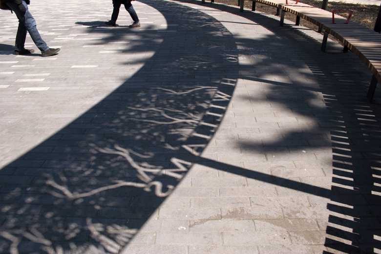 New accessible paths descend diagonally into the park along a previously abrupt slope, creating an informal amphitheatre facing the park, protected from traffic noise. (A portion of the steeper slope was retained so that kids could still enjoy rolling down it.) The tiny amphitheatre is a place to gather, play, or simply look into the park. Along the street, new seating is shaded by new red oaks and Freeman maples, as well as existing maples given new life in granular paved areas that improve root growth and irrigation.