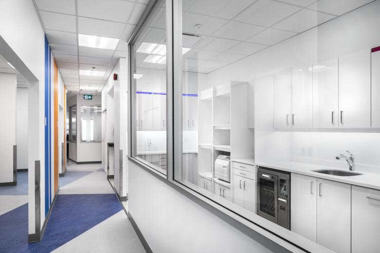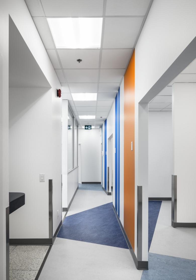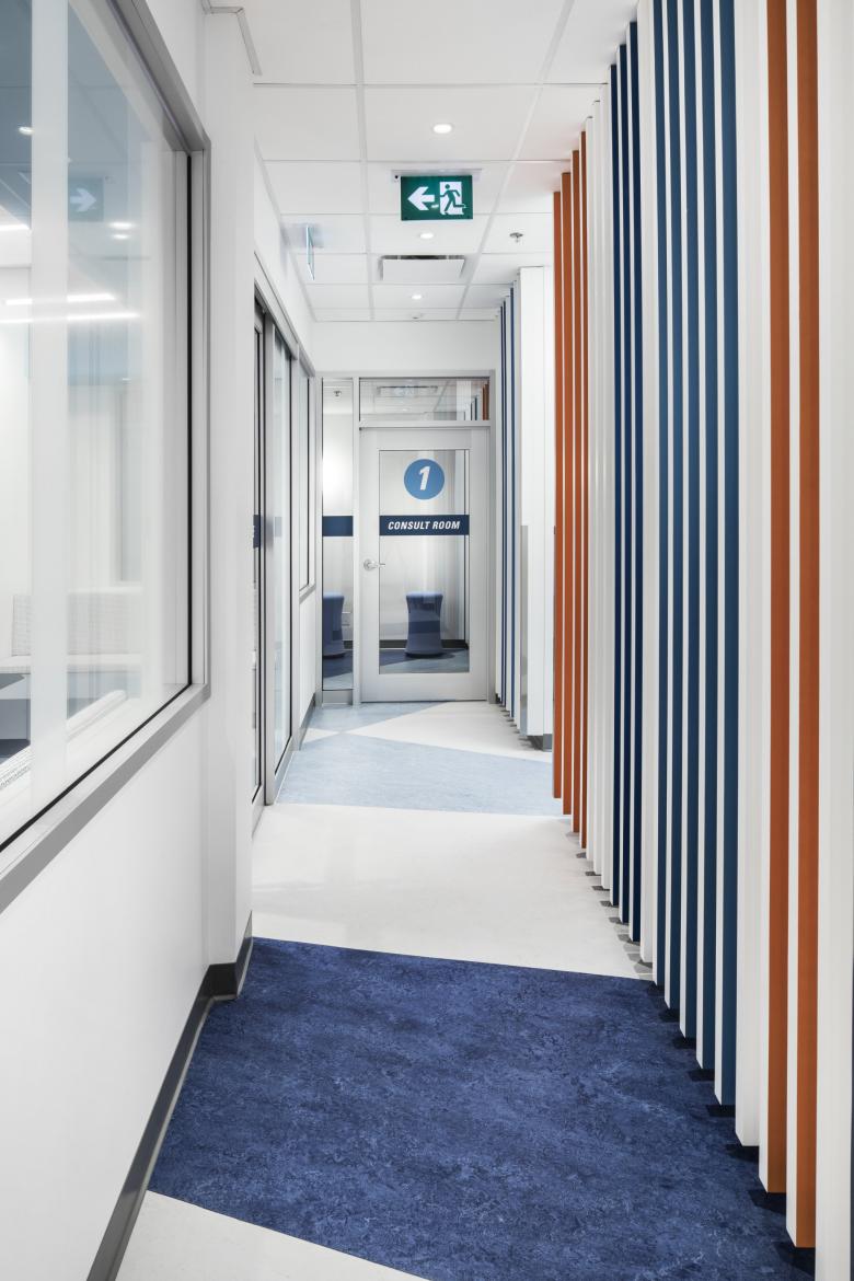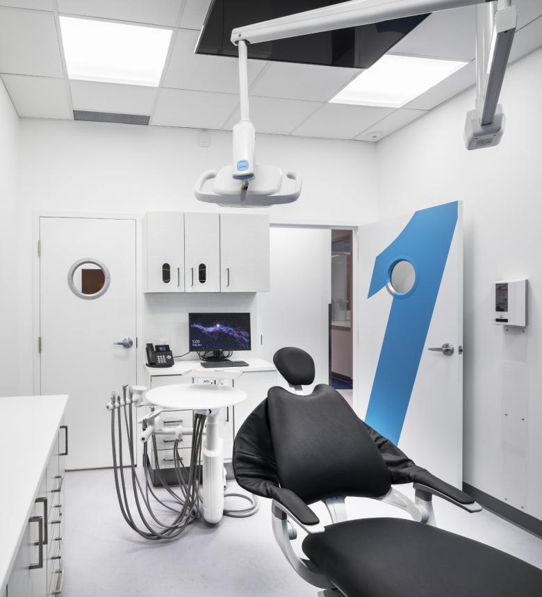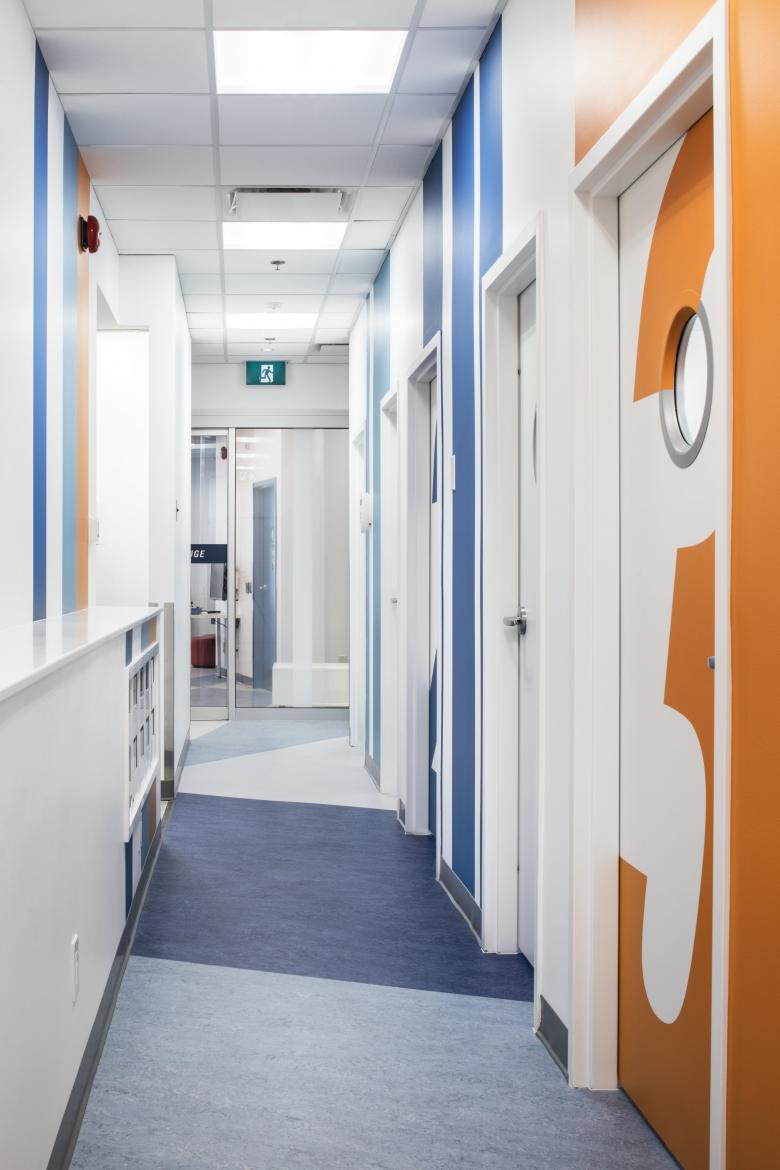 Vibrant accent colours, a painted slat feature wall, and supergraphic numbers spruce up conventional drywall partition and lay-in tile ceiling. Glass walls are all treated with bands of translucent vertical bands – in concert with the colour bands beyond, partially obscuring the views into the dental areas.