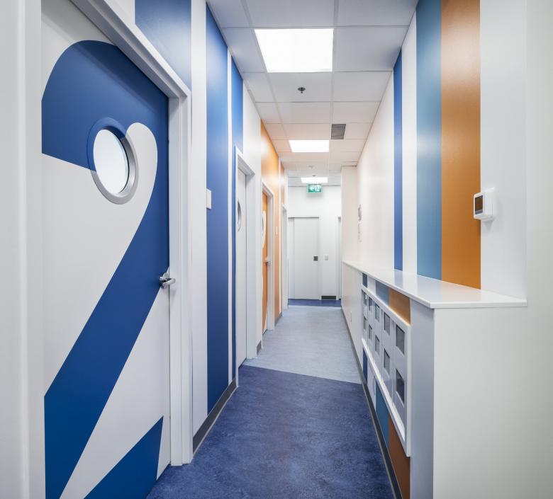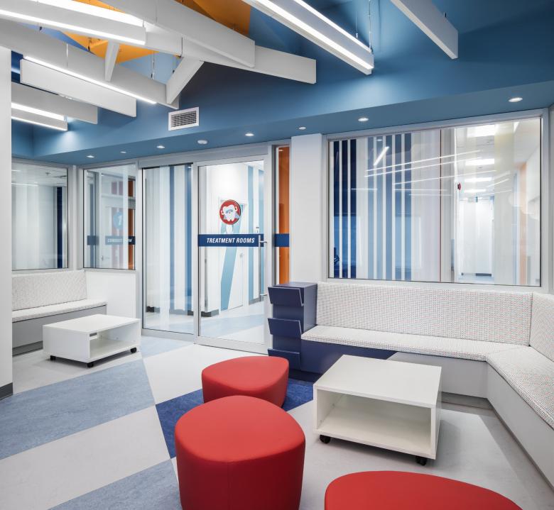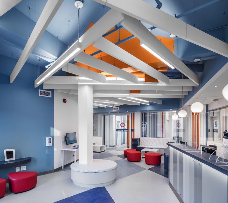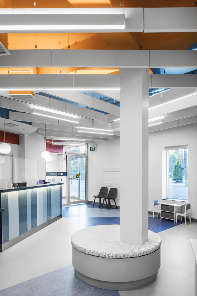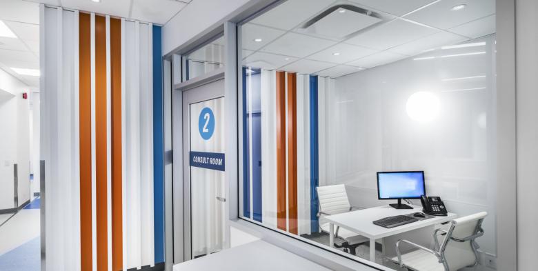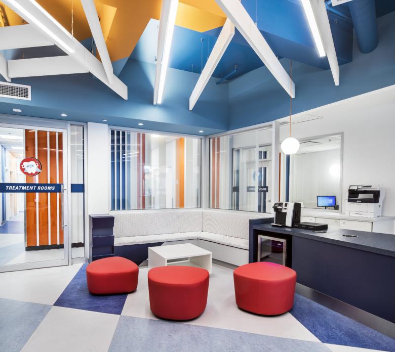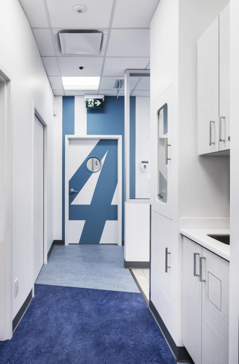 Vibrant accent colours, a painted slat feature wall, and supergraphic numbers spruce up conventional drywall partition and lay-in tile ceiling. Glass walls are all treated with bands of translucent vertical bands – in concert with the colour bands beyond, partially obscuring the views into the dental areas.