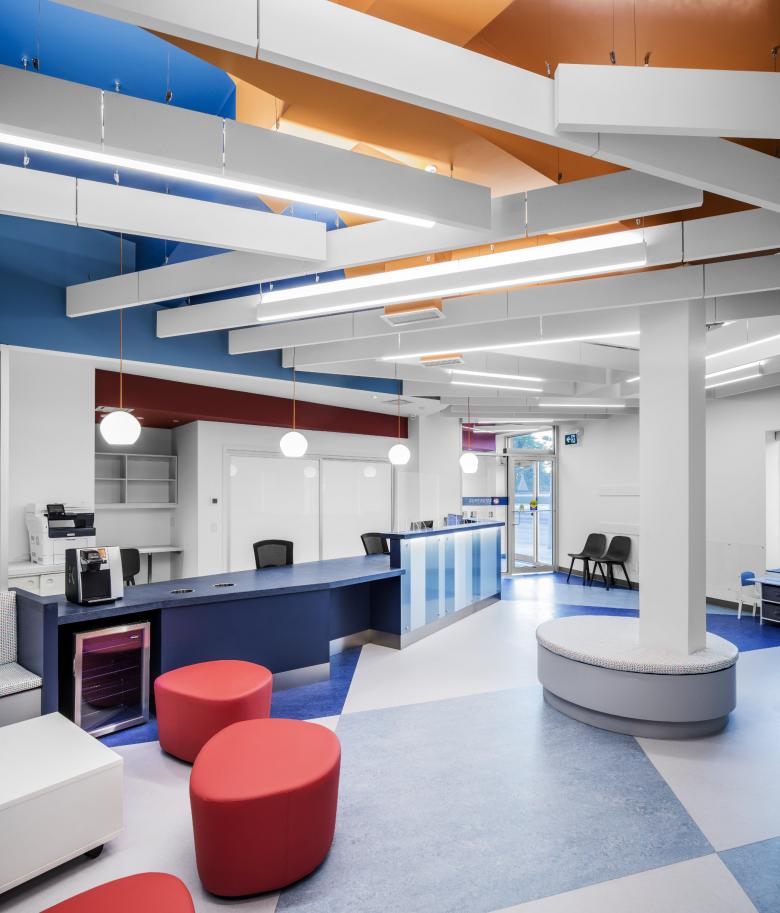 In the lobby, the ceiling and services are exposed to take advantage of the lofty height and suspended baffles provide sound attenuation.