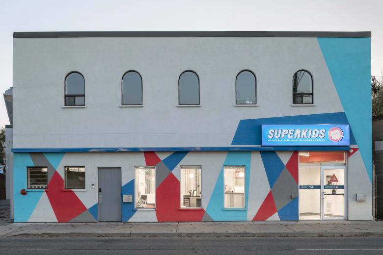 PLANT was hired to transform an old Spanish dance hall into a new paediatric dental office – Superkids. Launching her new practice for kids, teens and beyond, the client did not want the ‘babyish’ pediatric dentistries default setting. Instead, she wanted a vibrant environment that people of all ages will find cool. The Superkids name made us think of beams of light and comic-book graphic dynamism. With a limited budget to transform the dance hall into a place where kids would want to have their braces tweaked, we turned the entire facade into a graphic of projecting and intersecting light beams with paint, and carried the motif into the interior in three dimensions, where patterns on the floor bend up the wall like refracted flashlight beams. Existing terrazzo flooring is integrated with new linoleum.