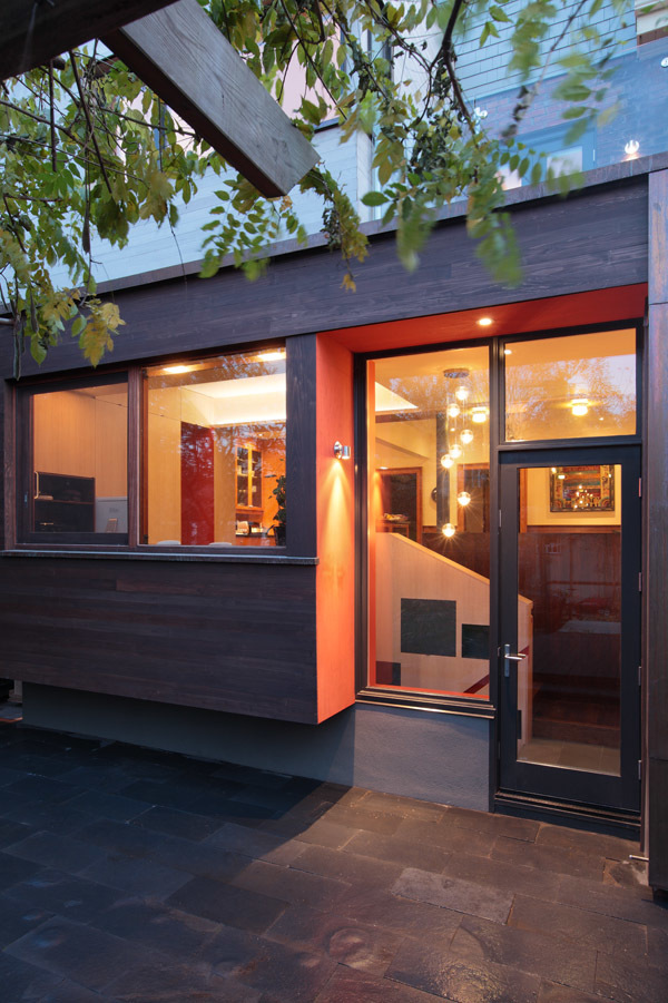 The addition addresses an enlarged and repaved garden patio with a custom gate and fence, both to provide privacy and security, and to provide access to bicycle and vespa parking. The second and third floor roof structures were designed to accommodate a green roof, which is to be installed this season.