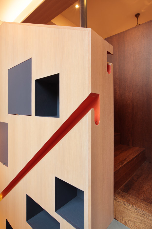 With its tree house-like aesthetic, overlooking and extending into the back garden, the addition has become a retreat for this growing family of five. The strong colour contrasts of light and dark against blue and orange, coupled with highly articulated details, bring a graphic, energizing, floating quality to the surfaces of the project. The interior has inspired the kids to utilize all aspects of the house as a playground, including using the stair handrail as a bright toy-car racetrack.