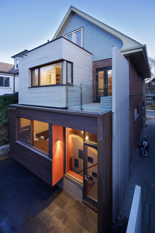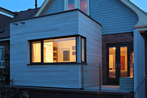 The new addition houses a bright open sunroom, homework area and rear entry at the ground floor, a bathroom and an intimate deck off the master bedroom at the second floor, and a cheerful mudroom at the basement level. Access to the sunroom is via an airy and colourful open stairwell, bathed in natural light. The focal point of the stair and sunroom is a sculpted custom wood cabinet with integral handrail.