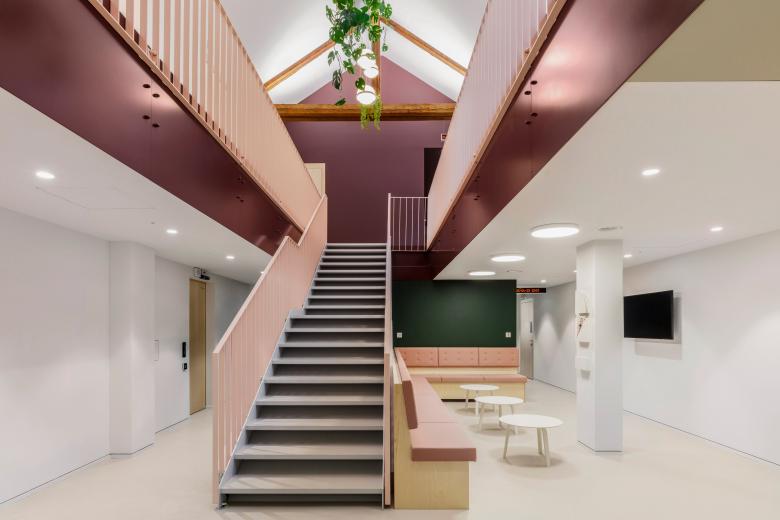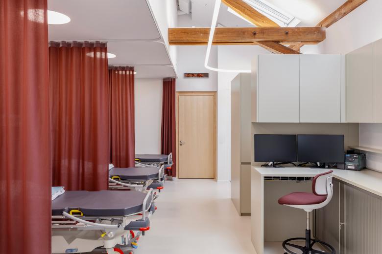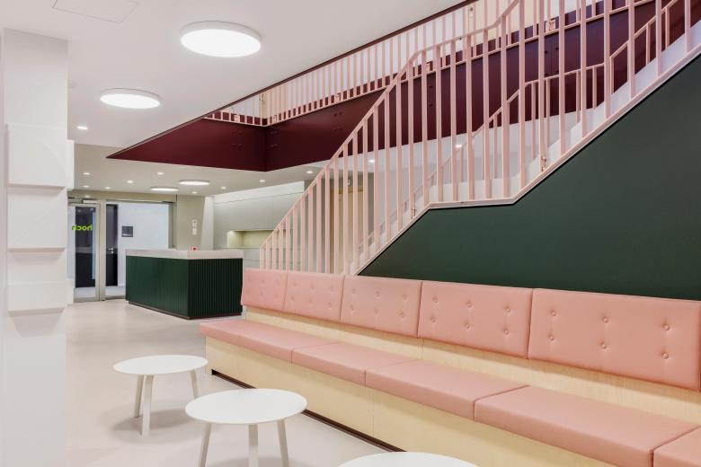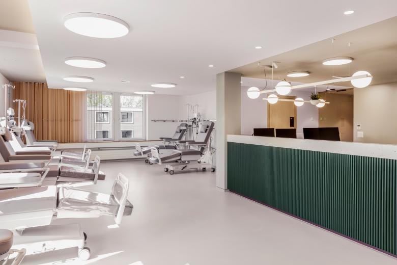 Das neue Gesundheitszentrum Rorschach von HOCH Health Ostschweiz – es befindet sich in den oberen beiden Geschossen eines umgenutzten Gebäudes – umfasst die Bereiche Onkologie, Kardiologie, Gastroenterologie und Urologie. Bei der Gestaltung der Praxisräume ging es unter anderem darum, ein passendes Farbkonzept zu entwickeln, das den Patienten ein positives und wohlbehütetes Gefühl vermittelt. Wände und Decken der Praxisräume sind hauptsächlich in Weiss gehalten, der fugenlose Gussboden mit Korkanteil ist in einem warmen Hellgrau-Beige ausgeführt. Ergänzend dazu setzt ein harmonischer Vierklang aus Rosé, Bordeaux, Hell- und Dunkelgrün frische Akzente und unterstützt zugleich bei der Orientierung. Kombiniert wurde dazu naturlackiertes Birkenholz, das bei den Türen, bei den Verkleidungen der Radiatoren sowie bei den Möbeln zum Einsatz kam.