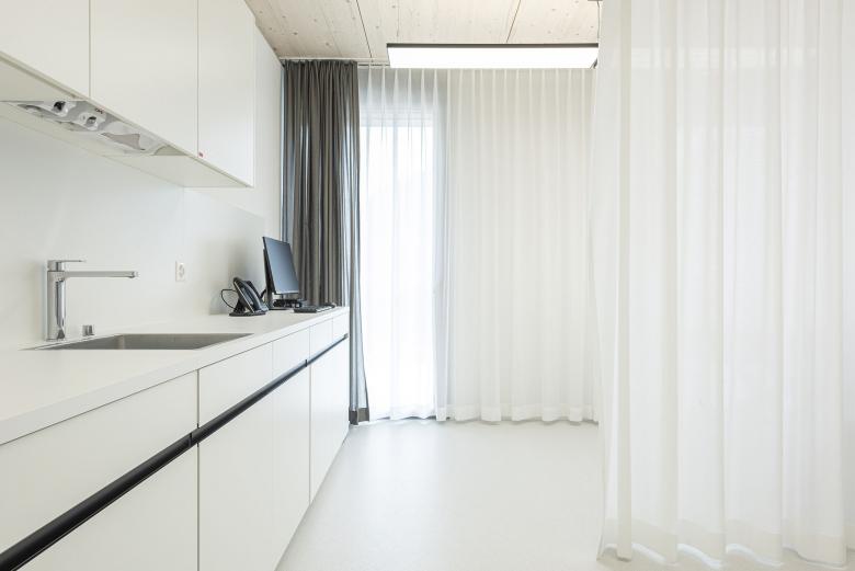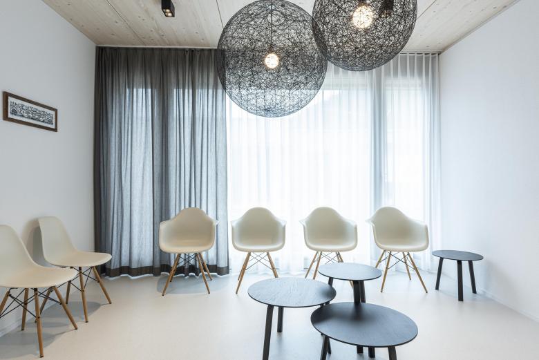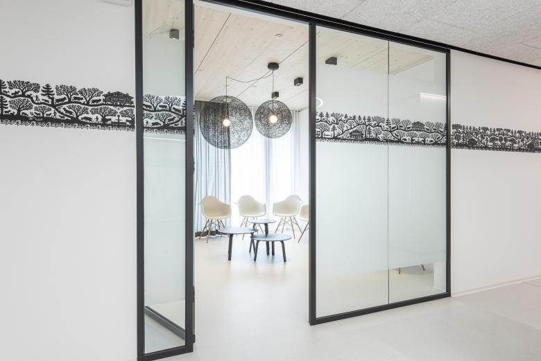 Am Standort Zweisimmen wird in der Praxis von Medbase eine Kunstform in den Fokus gerückt, die typisch ist für das Berner Oberland: der Scherenschnitt. Ein solcher zeichnet sich hier als schwarzes Band an der Wand ab. Bestehend aus gelasertem Edelstahlblech respektive Glasdekorfolie misst das dekorative Werk insgesamt eine Länge von fast 40 m. Die Vorlage für den Scherenschnitt lieferte ein lokaler Künstler Ueli Hauswirth, der sich von alpenländischen Motiven, aber auch vom Thema Gesundheitswesen inspirieren liess. So finden sich zwischen Gämsen und Chalets auch Krankenwagen und Verletzte auf Tragen wieder. Eine weitere gestalterische Besonderheit in der Praxis sind die Oberflächen in Tannenholz, die ebenfalls eine Brücke zu Natur und Alpenland schlagen.
