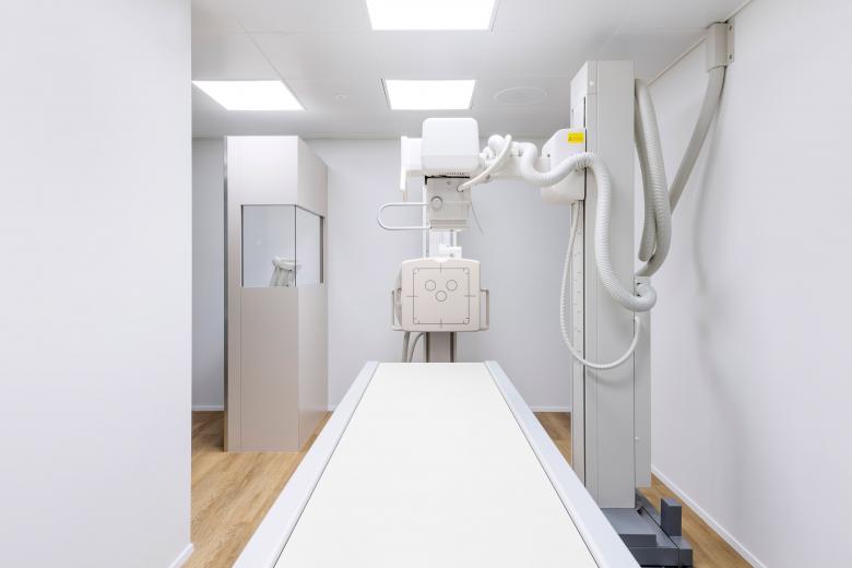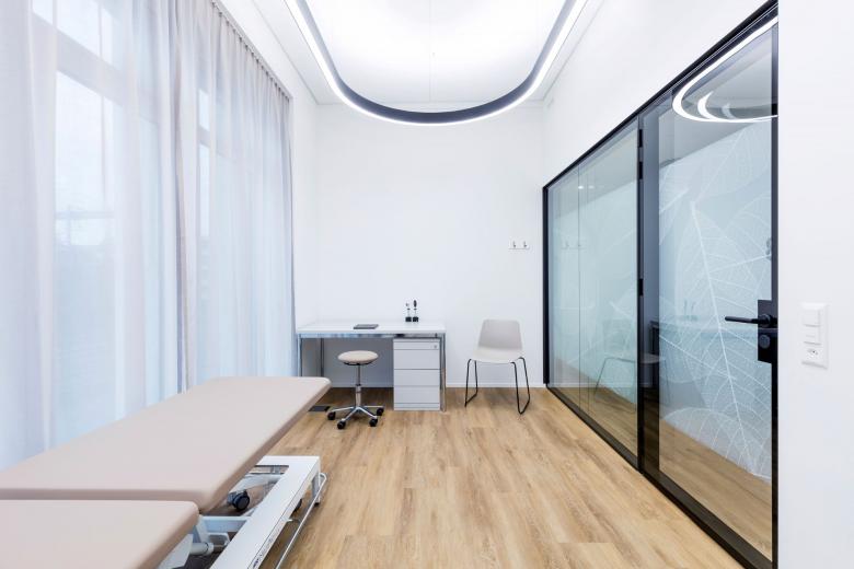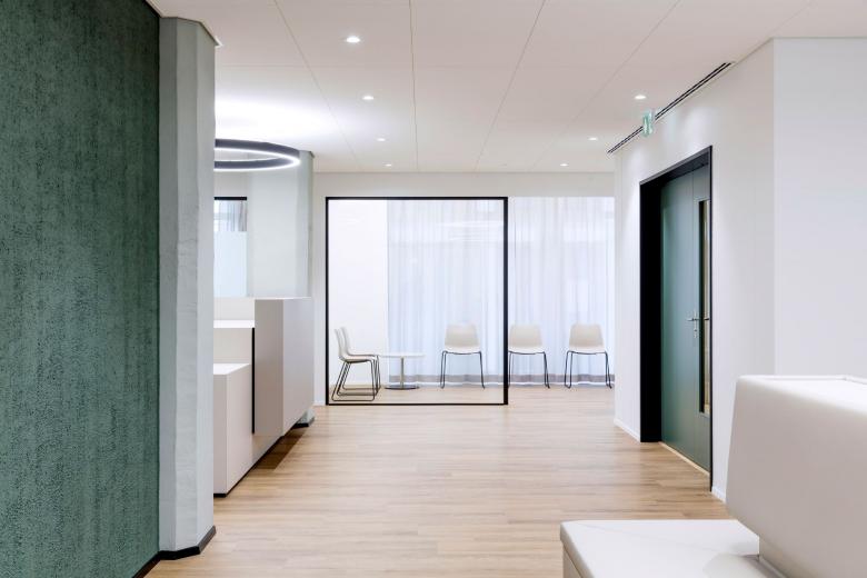 Das KSA Praxiszentrum Lenzburg – ein Ableger des KSA Kantonsspitals Aarau – hat auf dem ehemaligen Hero-Areal Einzug gehalten. Trotz des bestehenden Stützenrasters im Bestandsgebäude ist es hier gelungen, dem Geschoss (1. OG) ein eigenständiges Raum- und Gestaltungskonzept zu implementieren und die Praxis zu einem unverwechselbaren Ort zu machen. Vor allem das mutige Spiel mit Oberflächenstrukturen fällt dabei ins Auge: Die Wände des innenliegenden Gebäudekerns wurden – als Kontrastprogramm zu den ansonsten hellen und glatten Wand- bzw. Glasflächen – mit einem dunkelgrünen Rauputz versehen. Aufgetragen mit einer Nagelwalze, sind Haptik und Optik bewusst rustikal. Einen eleganten Kontrapunkt setzen die runden und ovalen Pendelleuchten sowie die Verglasungen, die mit feinen dunklen Frames akzentuiert werden. Darüber hinaus sind sie teilweise mit einem floralen Motiv beklebt.