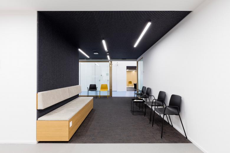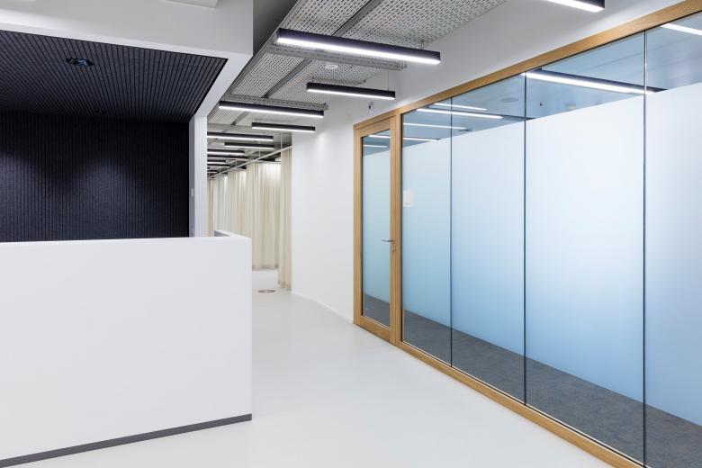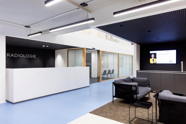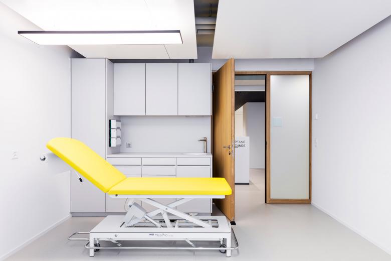Dass es sich bei dem Bauprojekt um eine Kooperation zwischen Hirslanden und dem Fussballverein BSC handelt, wird durch eine entsprechende Farbgestaltung sichtbar: Ein Band in Blau (CI-Farbe Hirslanden) – unverkennbar die Reminiszenz an eine Laufbahn – zieht sich an Boden und Decke quer durch das zweigeschossige Medical Center und verbindet dabei drei Bereiche: Physiotherapie, Radiologie und Sportmedizin. Das typische BSC-Gelb findet sich punktuell in Mobiliar, Türen und grossformatigen Bilder mit Fussballmotiven wieder.