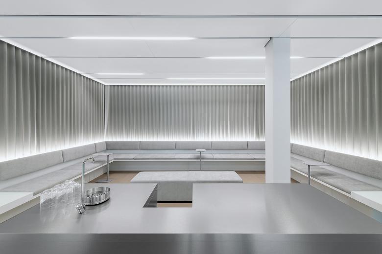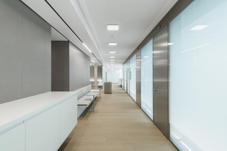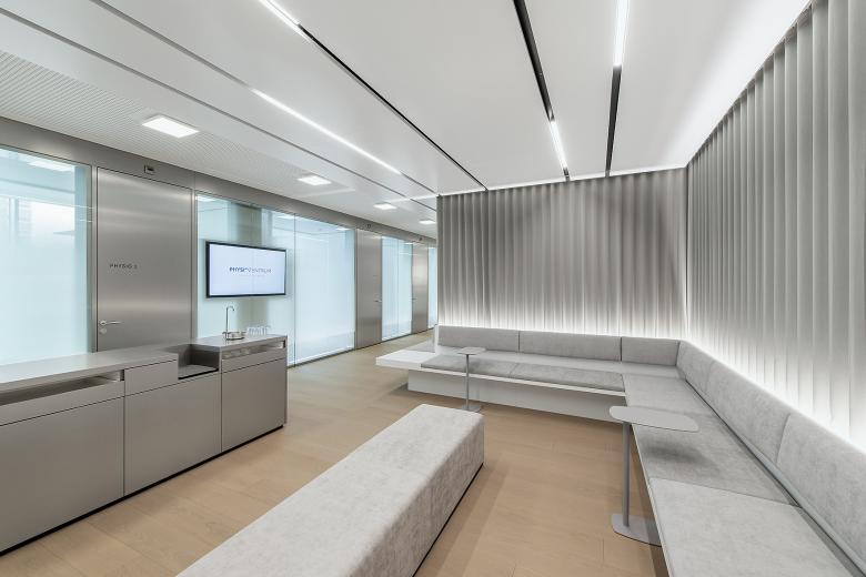Beim Umbau zur Praxis sollten Bestandselemente des ehemaligen Grossraumbüros weitestgehend übernommen und in die neue Gestaltung integriert werden. So beispielsweise die Lochdecke im Flurbereich. Um dennoch eine behagliche Atmosphäre zu schaffen, wurde der Wartebereich mit einer textilen Bespannung ausstaffiert. In regelmässige Falten gelegt und von unten beleuchtet, erzeugt das Textil eine raffinierte Raumwirkung. Für direktes Licht sorgen Deckenleuchten, die mit ihrer linearen Form dezent auf die parallel verlaufenden Bahngleise hinweisen.