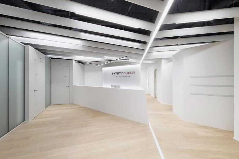 Das Gebäude in der Fussgängerzone am Claraplatz wurde bereits zig-fach umgenutzt: Mal war es Kino, mal war es Restaurant… Jede Umbaumassnahme hinterliess dabei ihre Spuren. Bei der Neugestaltung zur Praxis entschied man sich, diese gewachsenen Strukturen bewusst sichtbar zu lassen und ein Konzept zu entwickeln, bei dem Altes und Neues koexistieren können. Bestehende Sichtmauerwerke beispielsweise wurden belassen und lediglich gesäubert und geweisselt. Auch die Decke mit Lüftung und Elektrotrassen blieb bestehen. Dunkel gespritzt, tritt sie jedoch optisch in den Hintergrund. Die Aufmerksamkeit soll hier einem weissen Deckenelement mit identitätsstiftendem Charakter gebühren: Das dynamische Element spannt sich – ausgehend von einer beleuchteten Mittelachse – über die gesamte Praxis. Die abgehenden Seitenstränge, die an Blattadern erinnern, bestehen aus Textilbahnen (Glasfaservlies). Als Pendant zur beleuchteten Mittelachse wurde am Boden eine Aluminiumschiene eingelassen.
