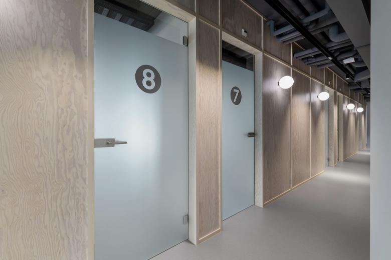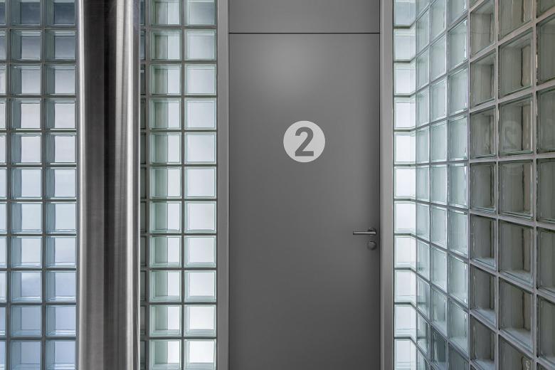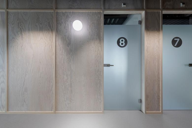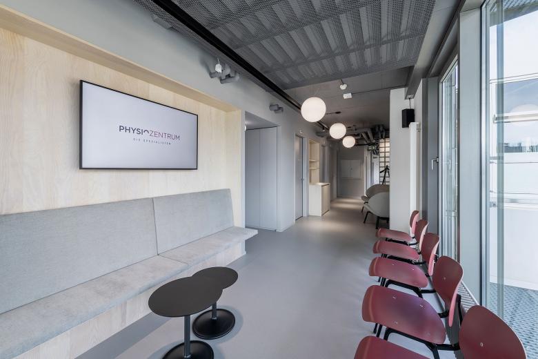Das Motiv „Schiff“ wurde im Inneren der Praxis weitergeführt: So ist beispielsweise der Handlauf am Empfangstresen wie eine Reling ausgebildet, und die runde Folienbeschriftung an den Türen der Behandlungszimmer zeichnet kleine Bullaugen nach. Der graue Bodenbelag aus Kautschuk, Glasbausteine sowie Elemente aus Streckmetall, die die Kältesegel an der Decke kaschieren, schaffen einen technisch-kühlen Grundcharakter der Räumlichkeiten. Wärmere Töne werden hingegen durch die Wände aus weiss lasierter Seekiefer angeschlagen. Zudem setzen Kugelleuchten – ein Novum in den Praxen des Physiozentrums – einen dekorativen Akzent.