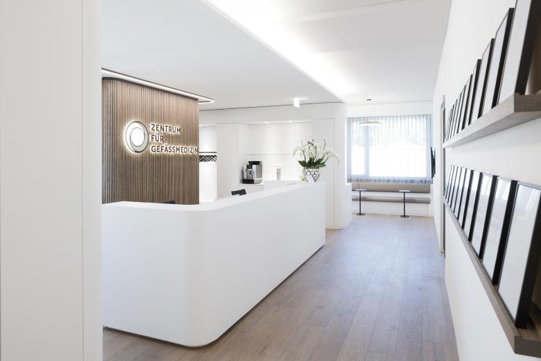Die Praxis für Angiologie in Baden-Dättwil ist einer von vier Standorten des „Zentrums für Gefässmedizin“ und befindet sich im Attikageschoss eines u-förmig angelegten Gewerbebaus. Dieser verfügt zwar über viel verglaste Fassadenfläche, bietet dafür aber nur eine geringe Raumtiefe. Um trotzdem ausreichend viele Behandlungsräume für vier Ärzte generieren zu können, wurde ein Mittelgang angelegt. Von diesem gehen beidseitig Zimmer ab, die in ihrer Fläche so klein wie möglich dimensioniert wurden. Platz konnte vor allem dadurch eingespart werden, indem man darauf verzichtete, in jedem der Untersuchungs- und Behandlungsräume einen eigenen Waschplatz einzurichten. Stattdessen befinden sich im Gang zwei offen zugängliche Nischen mit Lavabos. Schöner Nebeneffekt: Durch die Nischen wird der lange Erschliessungsgang optisch aufgebrochen.